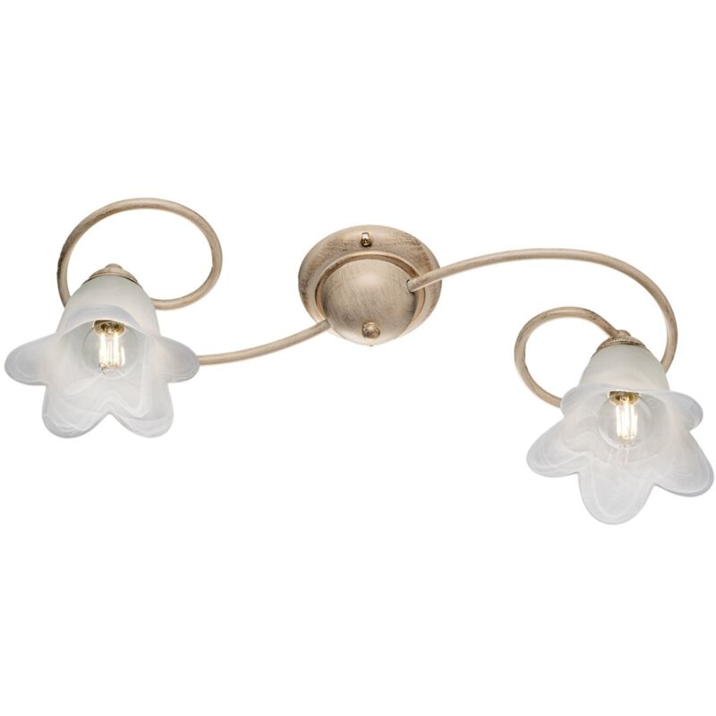 Collezione Alice LA DELICATEZZA DELL'ARTE POVERA Plafoniera a 2 luci in ferro battuto laccato con pittura termoindurente color avorio con decorazione oro. . Diffusori in vetro centrifugato alabastro bianco a forma di fiore con 5 punte. Design semplice ma curato, lavorato con maestria da mastri artigiani italiani con materiali made in Italy. Per gli amanti del genere classico, che non passa mai di moda. Disponibile anche nella versione marrone e oro.