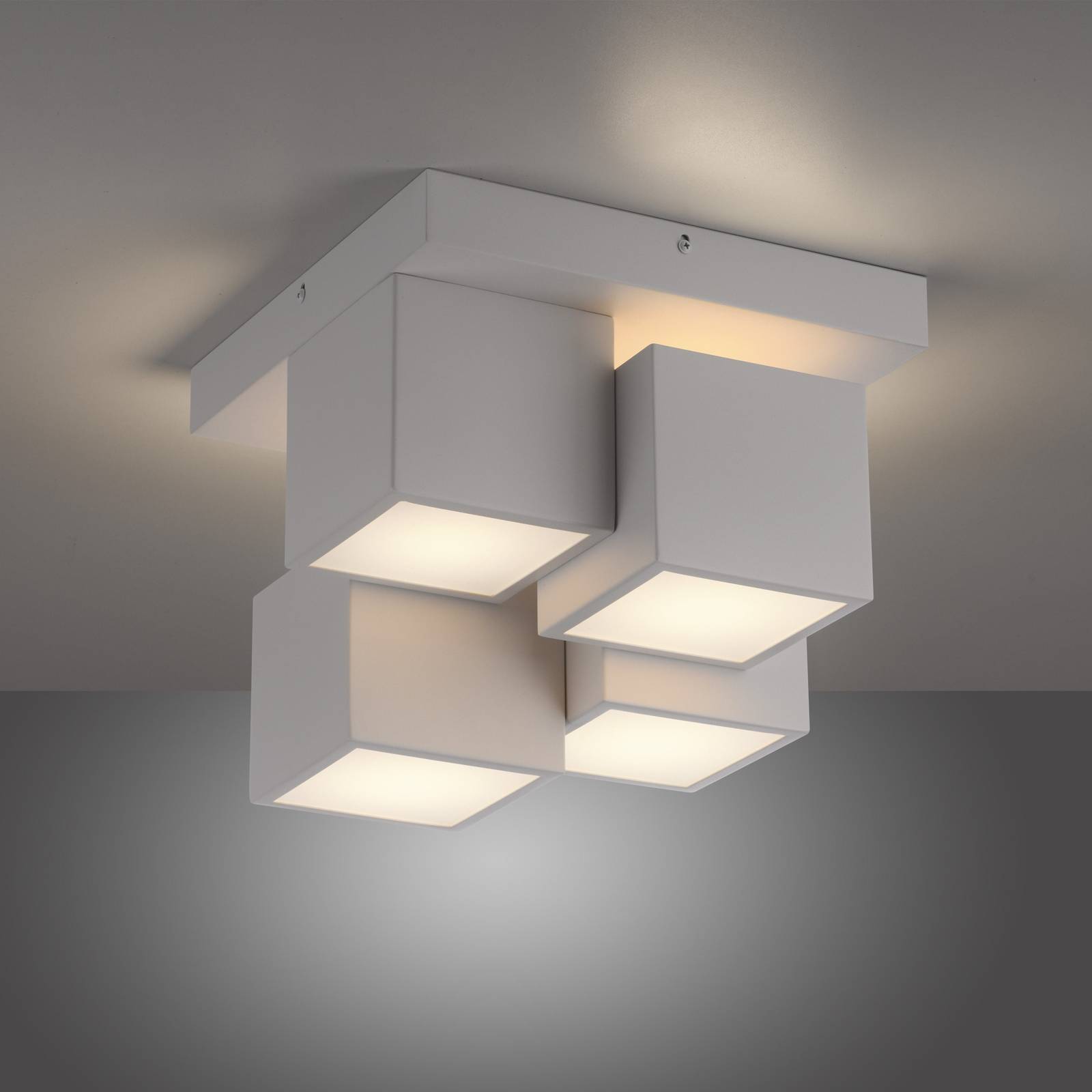 Plafoniera LED Tetris dal look angolare La plafoniera ED angolare Tetris è realizzata in metallo ed è dotata di quattro elementi luminosi a forma di cubo che si trovano ad altezze diverse sotto il rosone angolare. Ogni cubo è chiuso in basso da una copertura satinata, in modo da emettere una luce omogenea nell'ambiente. Una parte della luce fatto anche verso il soffitto, creando bellissimi effetti luminosi - Non dimmerabile - Materiale di montaggio incluso
