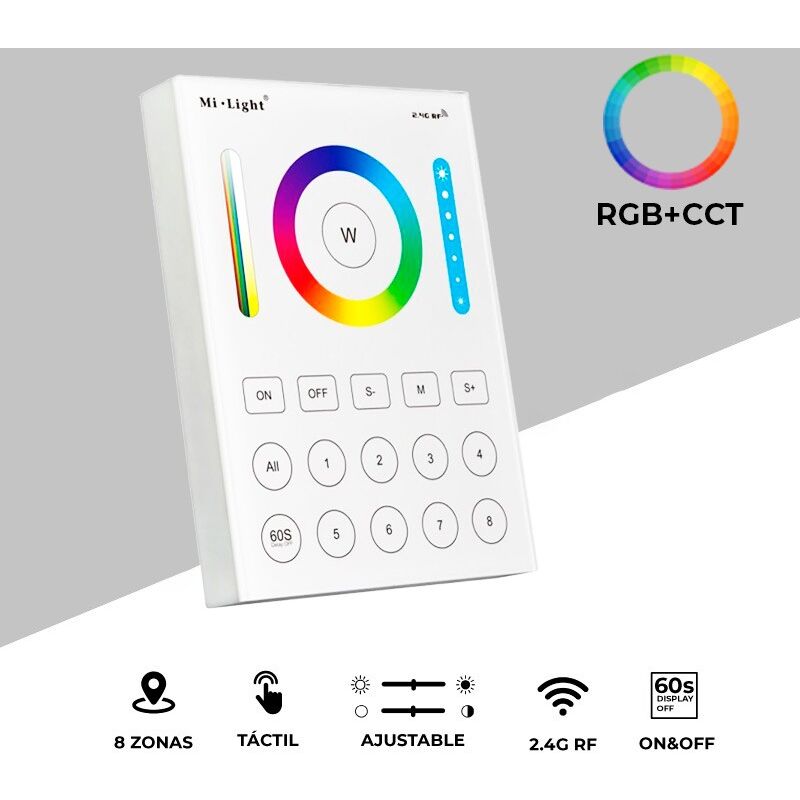 Pannello di controllo remoto a parete a 8 zone RGB+CCT. Controlla il colore, l'intensità/saturazione e la luminosità. Questo prodotto offre una gamma di 16 milioni di opzioni di colore. Regola la temperatura del colore da un bianco caldo di 2700 a un bianco freddo di 6500K. Perfetto per i prodotti RGBW e RGBCCT della serie Mi Light (faretti intelligenti, strisce intelligenti, ecc.). Trasmissione wireless 2.4G. È possibile sincronizzare tutti i dispositivi desiderati entro una distanza di 30 metri. Tensione di 3 V. Potenza di trasmissione: 6dBm. *Batterie AA non incluse.