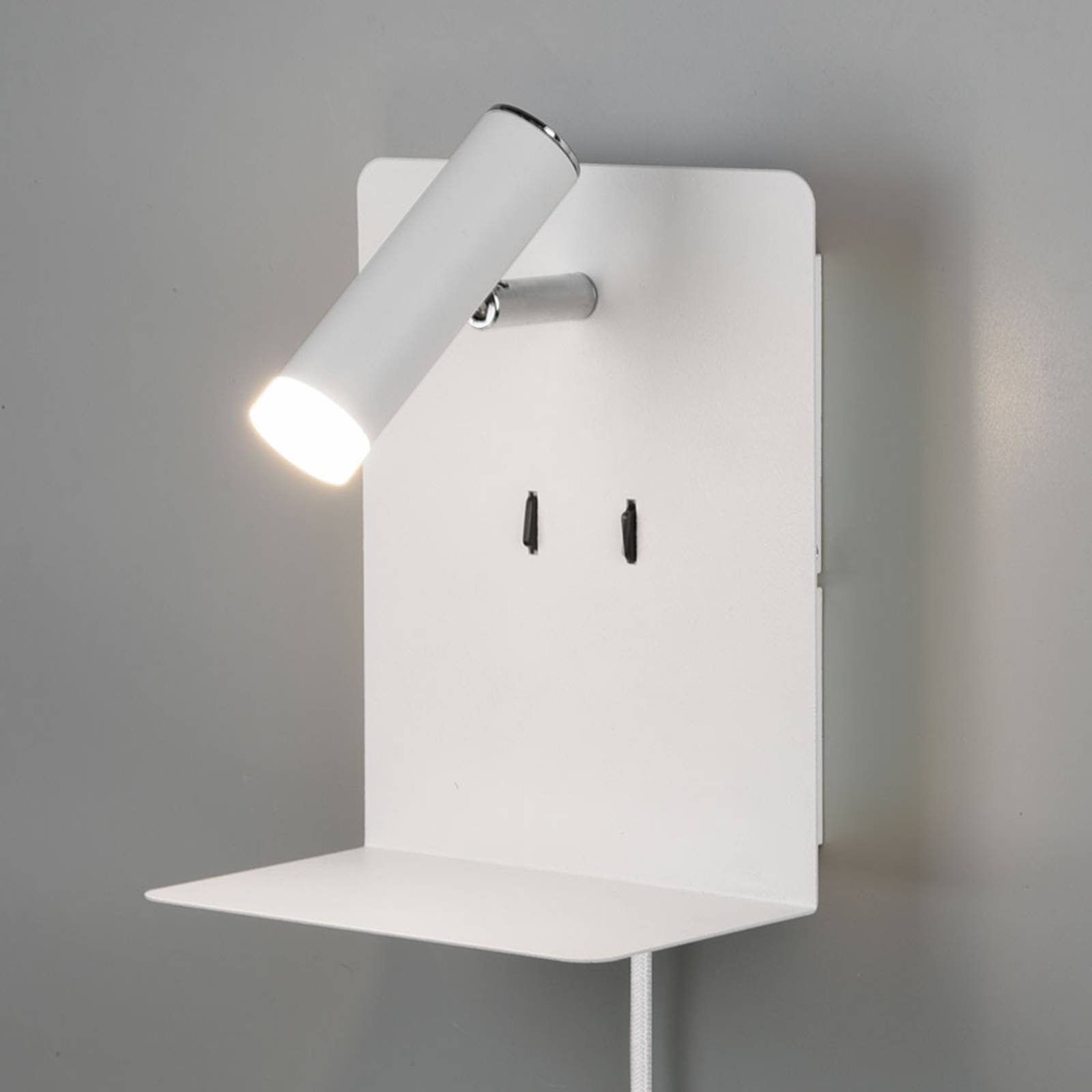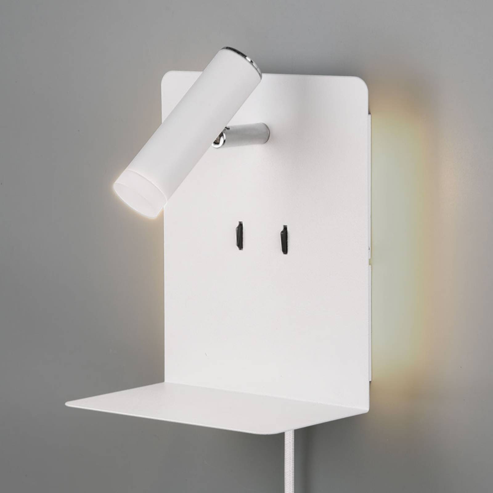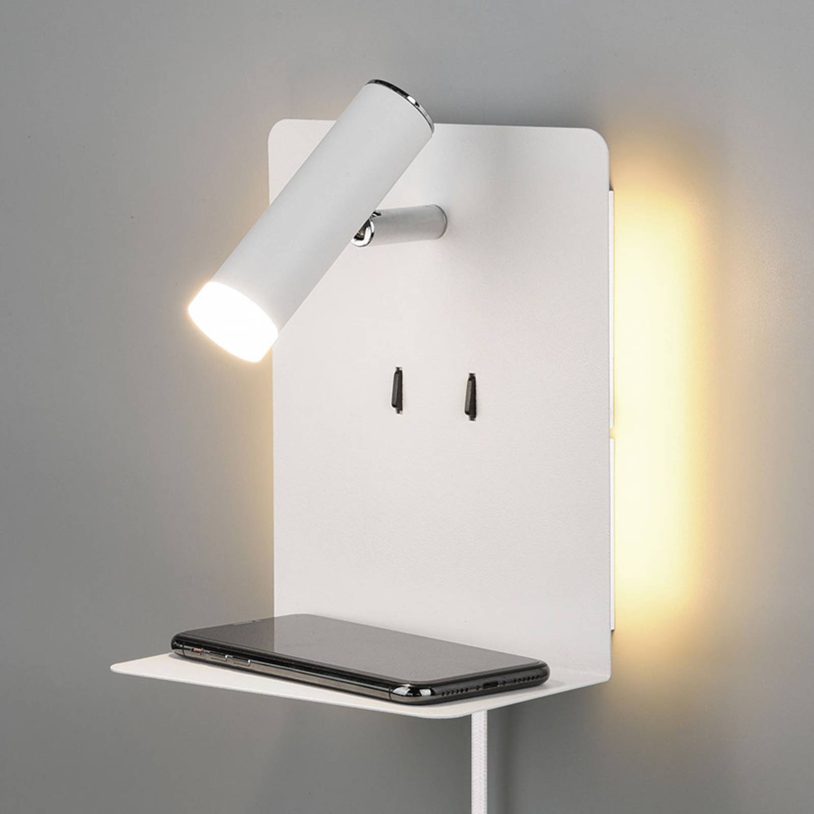 entrambe le varianti di luce possono essere attivate separatamente tramite due interruttori. La lampada da parete con mensola è inoltre dotata di una porta USB che consente di riporre e ricaricare contemporaneamente i telefoni cellulari. La moderna lampada da parete a LED Element è dotata di un cavo con spina che consente di collegarla a una presa di corrente. Se il cavo viene rimosso, può essere collegato direttamente alla presa a muro con Flex-Connect. L'elemento è una sorgente luminosa ideale da montare accanto al letto.
