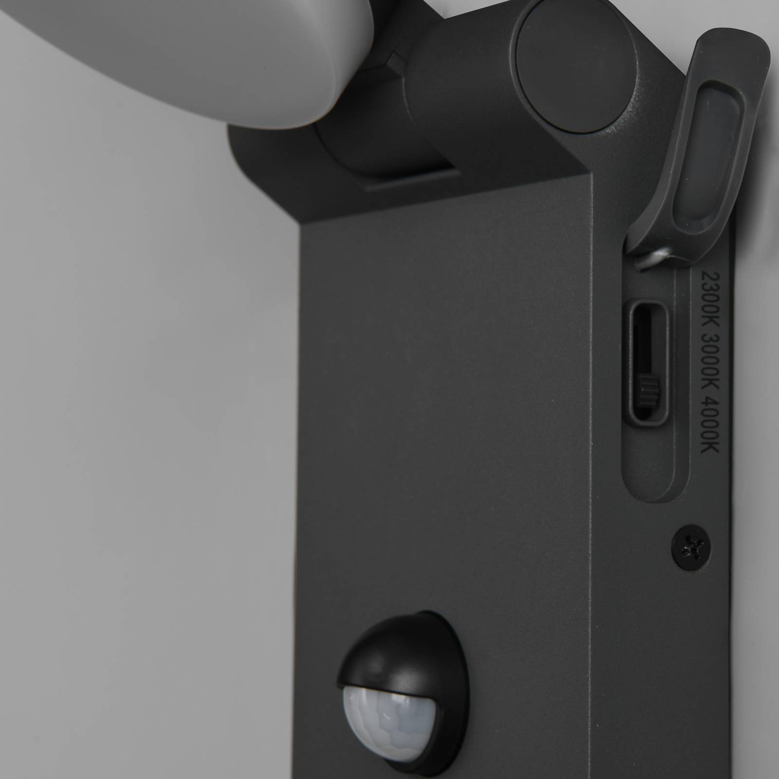 Con sensore di movimento - l'applique da esterno Adour LED L'applique da esterno Adour LED è un pratico elemento di illuminazione per l'ingresso o per i passaggi intorno alla casa. È dotata di un sensore di movimento che rileva i movimenti al buio e accende la luce. La luce viene emessa dalla testa rotonda dell'apparecchio, che può essere inclinata. Sul lato dell'alloggiamento angolare è integrato un interruttore DIP che consente di impostare il colore di luce su tre diversi livelli - Portata del sensore: 8 m - Angolo di rilevamento del sensore: 120° - Durata della luce regolabile da 10 secondi a 10 minuti - Sensore crepuscolare regolabile da 5 a 2000 lux - Altezza massima di montaggio per un funzionamento ottimale 2 m - Interruttore DIP integrato (2.300 K, 3.000 K o 4.000 K)