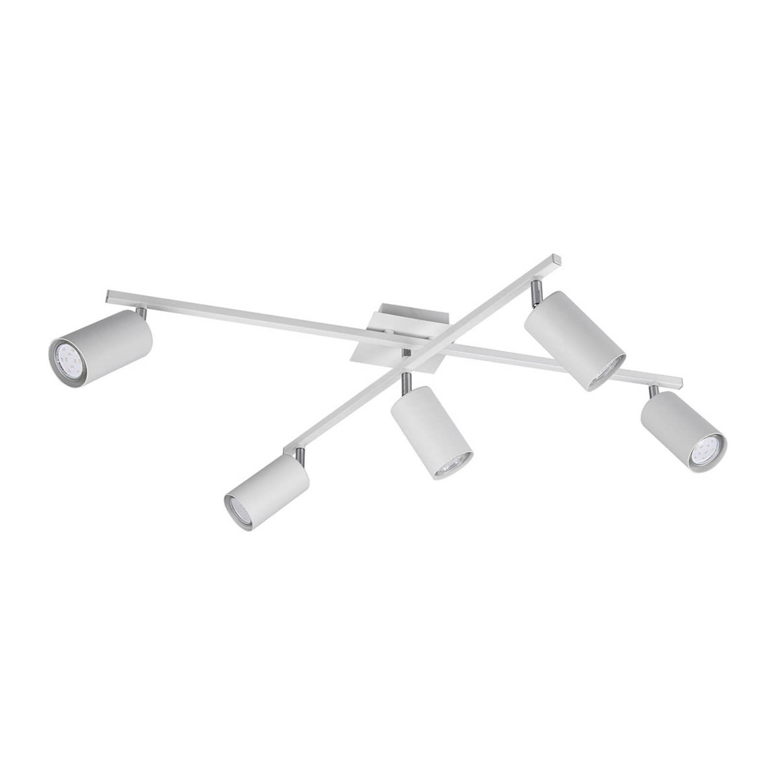 Faretto da soffitto Marley bianco con cinque faretti regolabili Il faretto da soffitto Marley bianco a 5 luci è in grado di fornire un'illuminazione d'ambiente per molti ambienti in un'ampia varietà di stili e schemi di colore. Un totale di cinque teste di faretto cilindriche sono montate su due sottili montanti, che possono essere orientati e ruotati per fare luce nelle direzioni desiderate. Anche la parte inferiore dei due montanti è orientabile. Il faretto a 5 luci viene fornito senza sorgente luminosa. Può essere dotato di lampadine alogene, ma per un'illuminazione efficiente dal punto di vista energetico si consiglia l'uso di moderne lampade LED a lunga durata (vedi accessori).