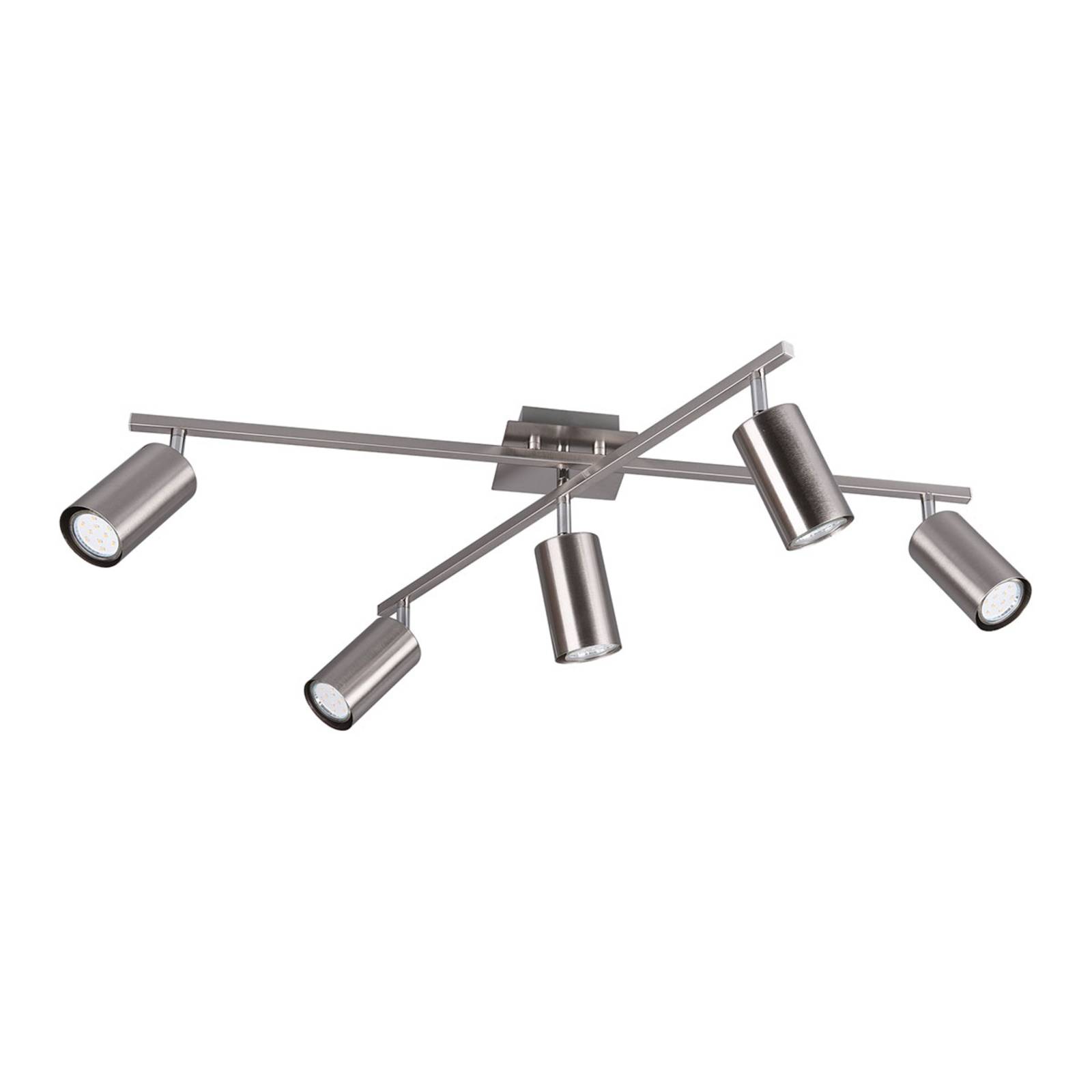 Faretto da soffitto Marley a cinque luci, nichel opaco Il faretto da soffitto Marley a 5 luci è un sistema d'illuminazione universale, adatto a diversi ambienti e stili di arredamento. È formato da due sottili barre sovrapposte, alle quali sono fissati a distanza regolare cinque faretti a forma cilindrica. La barra inferiore può essere orientata nella posizione desiderata, così come ogni singolo faretto. Questo consente di creare, con la plafoniera Marley a 5 luci, uno scenario luminoso adatto ad ogni ambiente e situazione.
