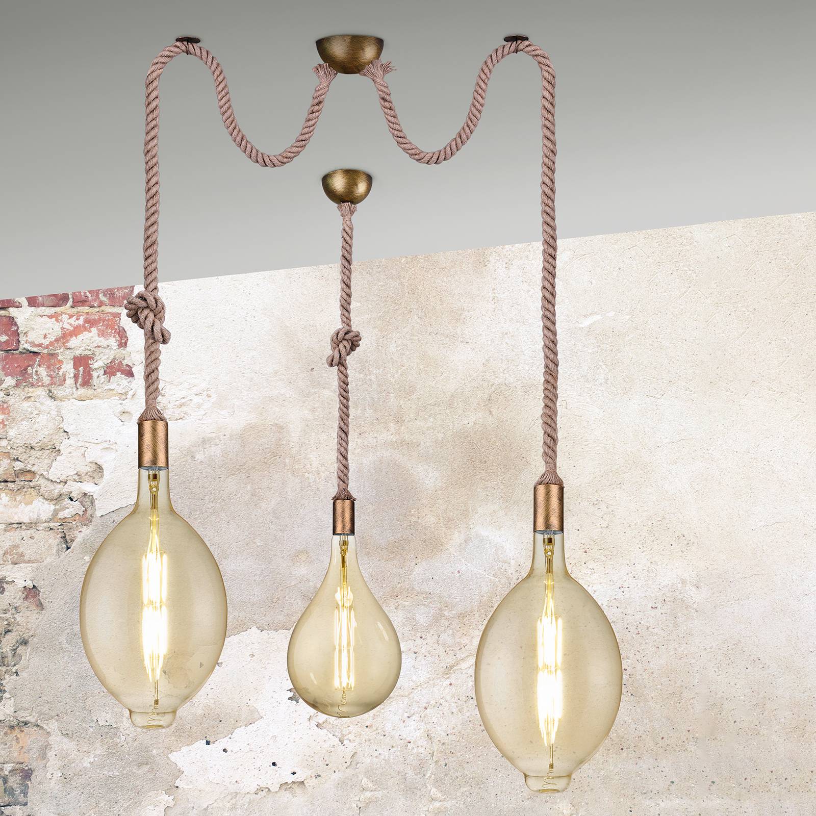 Rope - lampada a sospensione a una luce con fune di sospensione decorativa La sospensione di questa lampada, formata solo da un rosone e un portalampada, consiste in una fune spessa con un semplice nodo al centro. Rosone e portalampada sono realizzati in metallo con finitura ottone antico, che conferisce alla lampada un carattere rustico-country. Il portalampada E27 è adatto per ogni tipo di lampadina con attacco idoneo, ma naturalmente i modelli che si sposano al meglio con lo stile rustico della lampada sono le lampadine a bulbo o quelle con tecnica a filamento.