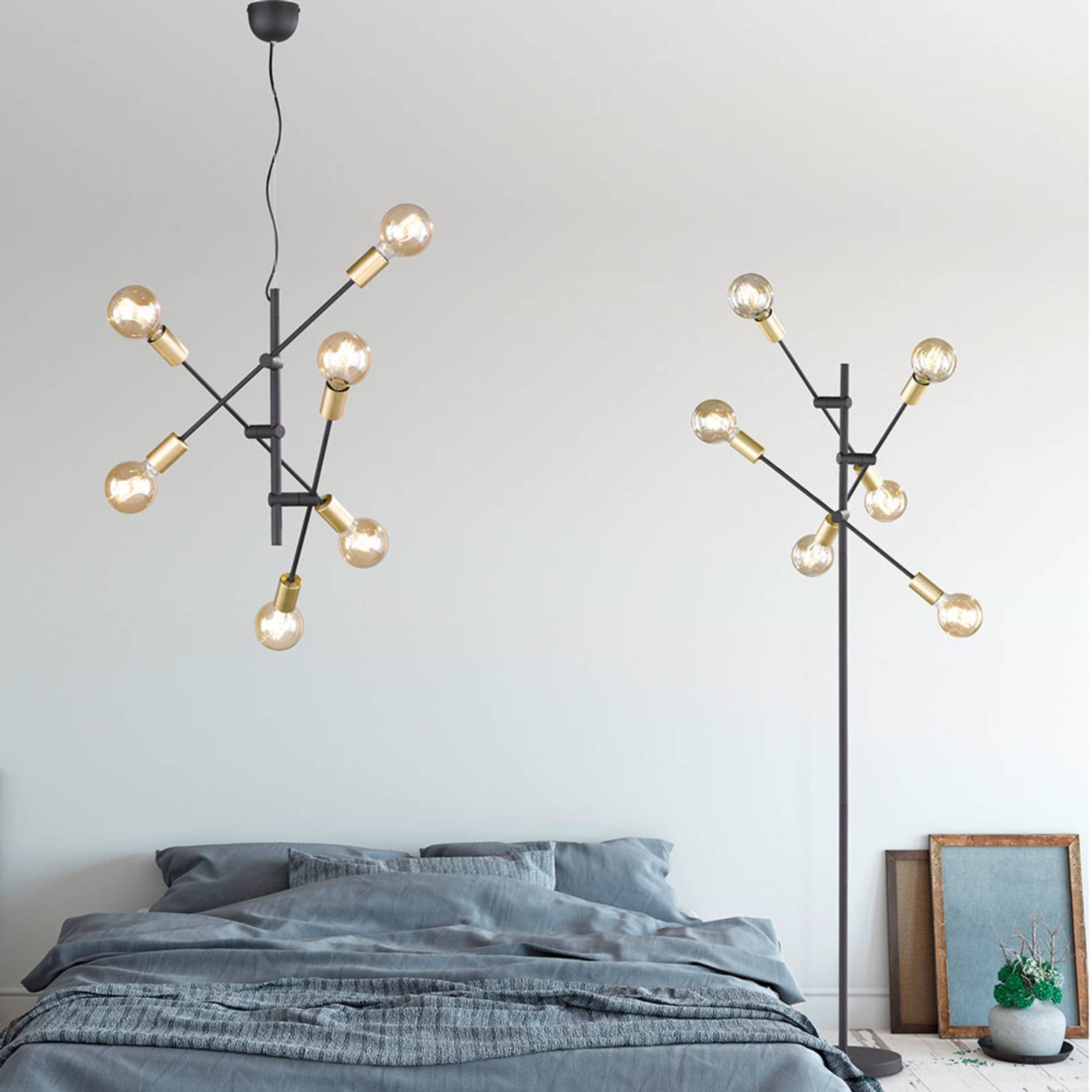 La lampada da terra Cross valorizza ogni ambiente con la sua urbana eleganza che fa tendenza Il nero satinato della lampada da terra Cross risalta soprattutto se abbinato ad arredamenti moderni e minimalisti. La combinazione di portalampada dorati e lampadine bene in vista trasmette un certo fascino urbano che oggi fa tendenza. I tre singoli bracci che terminano con le lampadine si possono orientare singolarmente, personalizzando così l'illuminazione. La lampada da terra è provvista di un pratico interruttore a pedale con cui si accende e spegne la luce. Costituisce un funzionale complemento d'arredo, soprattutto in salotto o in camera da letto. La lampada torna utile anche come luce di lettura.