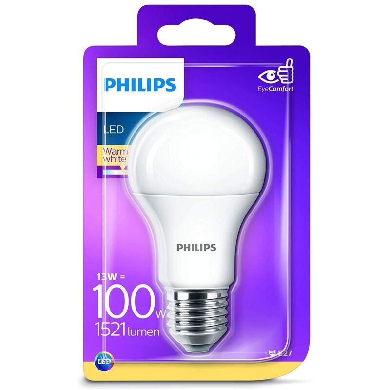 Elevata qualita' della luce Lunga durata ed efficienza energetica Luce bianca naturale calda Potenza 13 W equivalenti a 100 W Attacco E27, forma goccia LED e risparmio energetico La lunga durata di vita delle luci LED Philips ti consentira' di sostituire le lampadine con meno frequenza e il risparmio energetico offerto da questi prodotti comportera' anche una spesa inferiore. I LED Philips utilizzano fino all'85% di energia in meno rispetto alle lampade a incandescenza diffondendo comunque la meravigliosa luce calda a cui sei abituato. Una lampadina LED puo' durare fino a 15.000 ore proprio come 15 lampadine a incandescenza: cio' significa che non solo dovrai sostituire meno lampadine ma produrrai anche meno rifiuti. Investi sulla tua casa e lascia che Philips ti consenta di farlo al meglio. Forma: lampadina Voltaggio: 220 - 240 V Potenza effettiva: 13 W Potenza lampada equivalente: 100 W