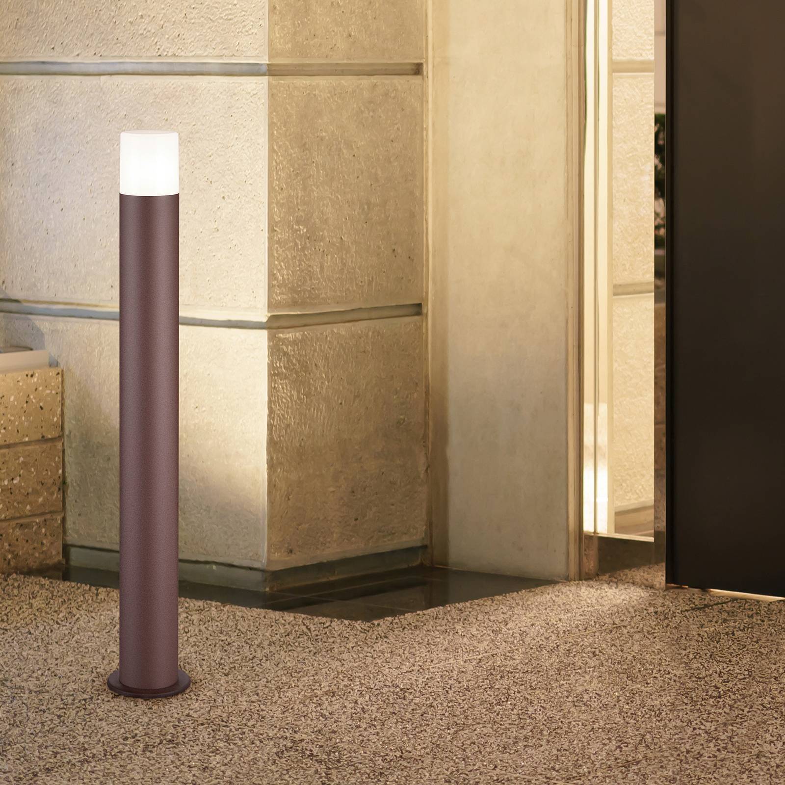 Lampioncino Hoosic di forma cilindrica Il lampioncino cilindrico Hoosic trova posto in qualsiasi zona all'esterno. È costruito in alluminio pressofuso e verniciato in color ruggine. Il piccolo paralume di plastica bianca diffonde la luce tutto intorno. Per il funzionamento si possono usare lampadine ad attacco E27 tradizionali oppure lampadine a LED, efficienti e durature. Le lampadine non sono allegate.