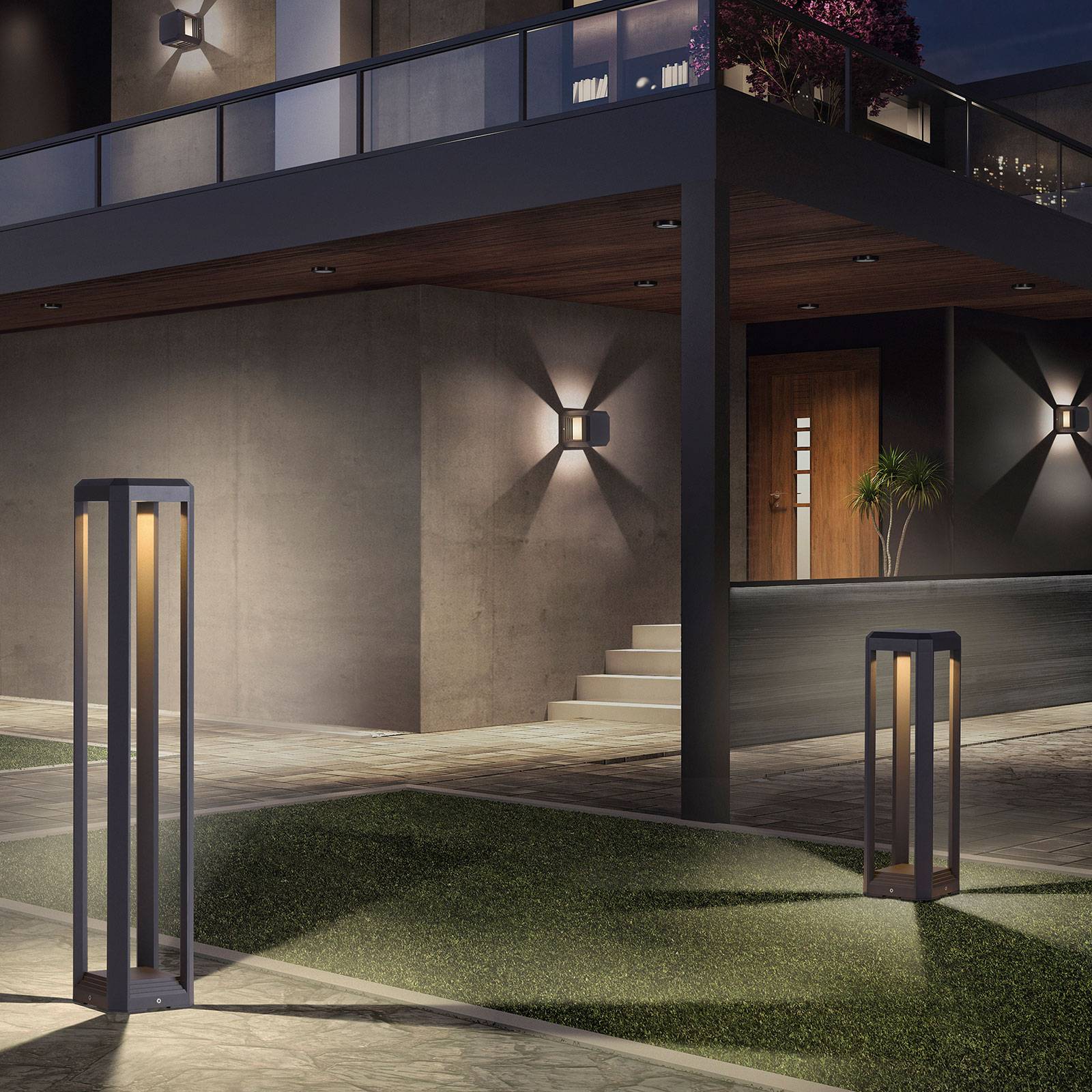Suggestivi giochi di luce - lampioncino a LED Logone Il moderno lampione a LED Logone piace a prima vista per l'eleganza del suo design. La costruzione è aperta su tutti e quattro i lati e quindi diffonde la luce tutto intorno. In aggiunta proietta sulla pavimentazione un incantevole gioco di luci ed ombre. La lampada contiene efficientissimi LED di marca OSRAM che emettono una morbida luce bianca di tonalità calda. I LED sono inseriti nella parte in alto in modo da non essere visti direttamente.