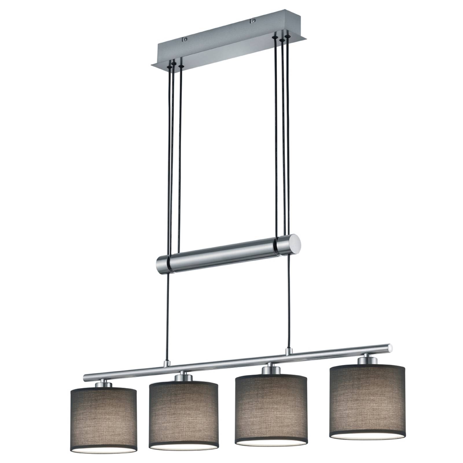 Lampada a sospensione a 4 luci Garda - regolabile in altezza fino a 150 cm La lampada a sospensione a 4 luci Garda è ideale per l'illuminazione del tavolo in una sala da pranzo o in un soggiorno moderno: I quattro paralumi in tessuto grigio, distribuiti su una lunghezza di 77 cm, Mite una luce diretta verso il basso per una distribuzione omogenea della luce. Inoltre, la luce penetra delicatamente attraverso il tessuto, creando un'atmosfera molto accogliente. L'altezza della lampada a sospensione Garda può essere regolata con una maniglia all'altezza desiderata, tra 90 cm e 150 cm.
