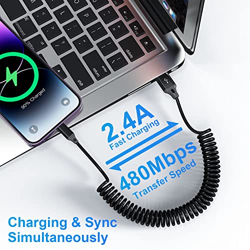 Cavo Lightning a spirale elastico: il cavo Lightning a spirale è normale di 0,4 m, può essere allungato fino a 1,2 m, comoda lunghezza di allungamento di 0,6 m - 0,9 m. Puoi sdraiarti sul divano o sul divano e utilizzare i tuoi dispositivi mentre stai caricando allo stesso tempo. E puoi usarlo liberamente in camera da letto, in ufficio e persino nel sedile posteriore della tua auto.