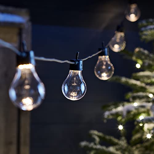 Questa catena di 10 lampadine trasparenti Core Connect di 5 metri con 20 LED bianchi caldi e' conforme alle norme CE ed IP44 per uso in esterni