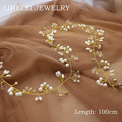 LIHELEI 100CM Fascia per Capelli da Sposa, Accessori per Capelli di Perle e Strass, Gioielli da Sposa per Nozze e Banchetti - Oro