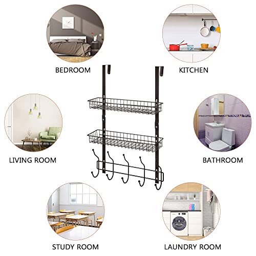 Liheya - Appendiabiti da porta in acciaio resistente, ideale da appendere sopra la porta, con 5 ganci e 2 cestini per bagno, camera da letto, ufficio (marrone)