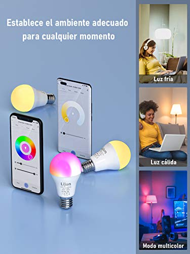 Lijun Lampadina WiFi Smart LED Lampadina Intelligente E27, 9W 800LM Compatibile con Alexa, Google Assistant, IFTTT RGBCW Multicolore Dimmerabile 2800-6200K (2 pcs)