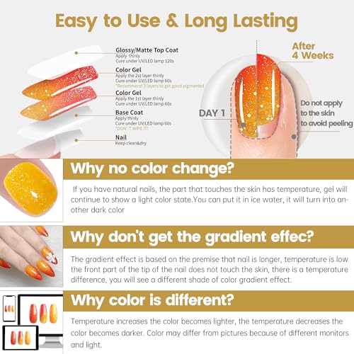 ➊【Che Cambia Colore con la Temperatura】Questo splendido gel cambia colore in temperatura, dopo aver applicato la temperatura è più di 31 ℃ o meno di 28 ℃, il gel presenterà diversi colori belli, come la magia del colore, quando la temperatura è alta per i colori chiari, quando la temperatura è bassa per i colori scuri.Il colore rosa chiaro/rosso scuro ha un effetto traslucido alle alte temperature e una buona copertura alle basse temperature.
