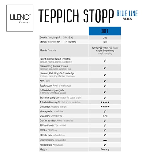 Il nostro tappetino antiscivolo è certificato Ökotex e lavabile in lavatrice. L'attenta selezione dei materiali del tappo aumenta la durata del vostro tappeto o del tappeto, poiché questo è meno stressato durante l'uso quotidiano
