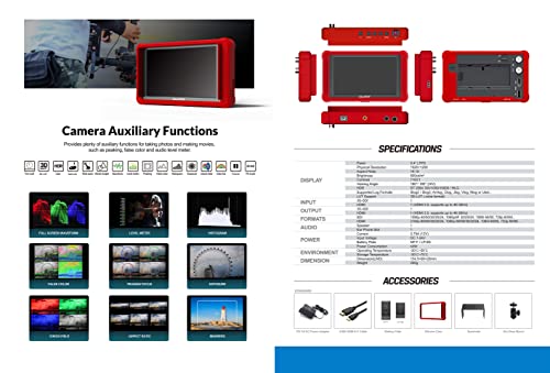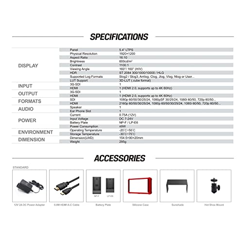 Il monitor professionale sulla fotocamera si abbina alla videocamera FHD/4K e alla fotocamera DSLR. Lo schermo con risoluzione nativa Full HD da 5,4 pollici 1920 × 1200 presenta una qualità dell'immagine fine e una buona riproduzione dei colori.