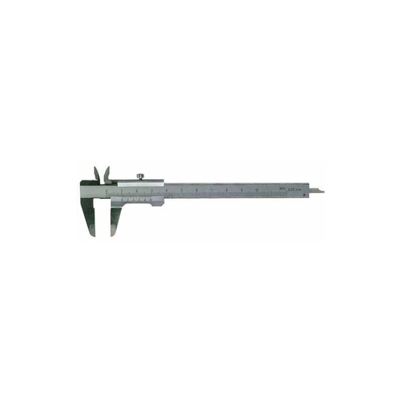 In acciaio. Cromo opaco. Laureato in millimetri e con calibro 1/20 mm. Con profondimetro e punti per la misurazione interna. DIN 862.