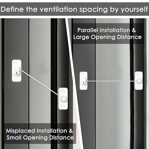 [Ventilazione limitata]: le serrature di sicurezza delle finestre garantiscono sicurezza consentendo al tempo stesso la circolazione dell'aria fresca, creando un ambiente interno sano e confortevole. È possibile regolare da soli la distanza di installazione del blocco di sicurezza per controllare la dimensione appropriata della finestra.