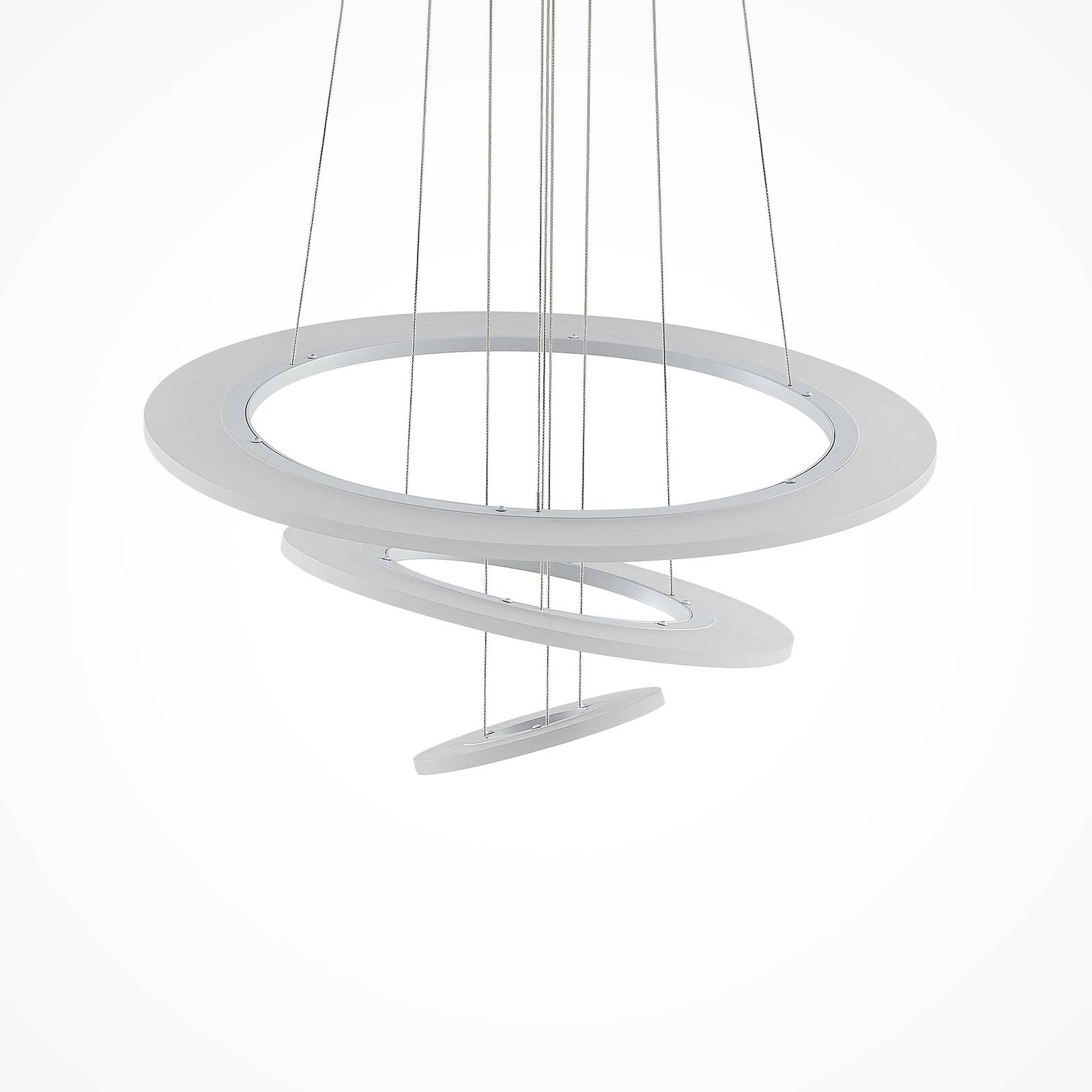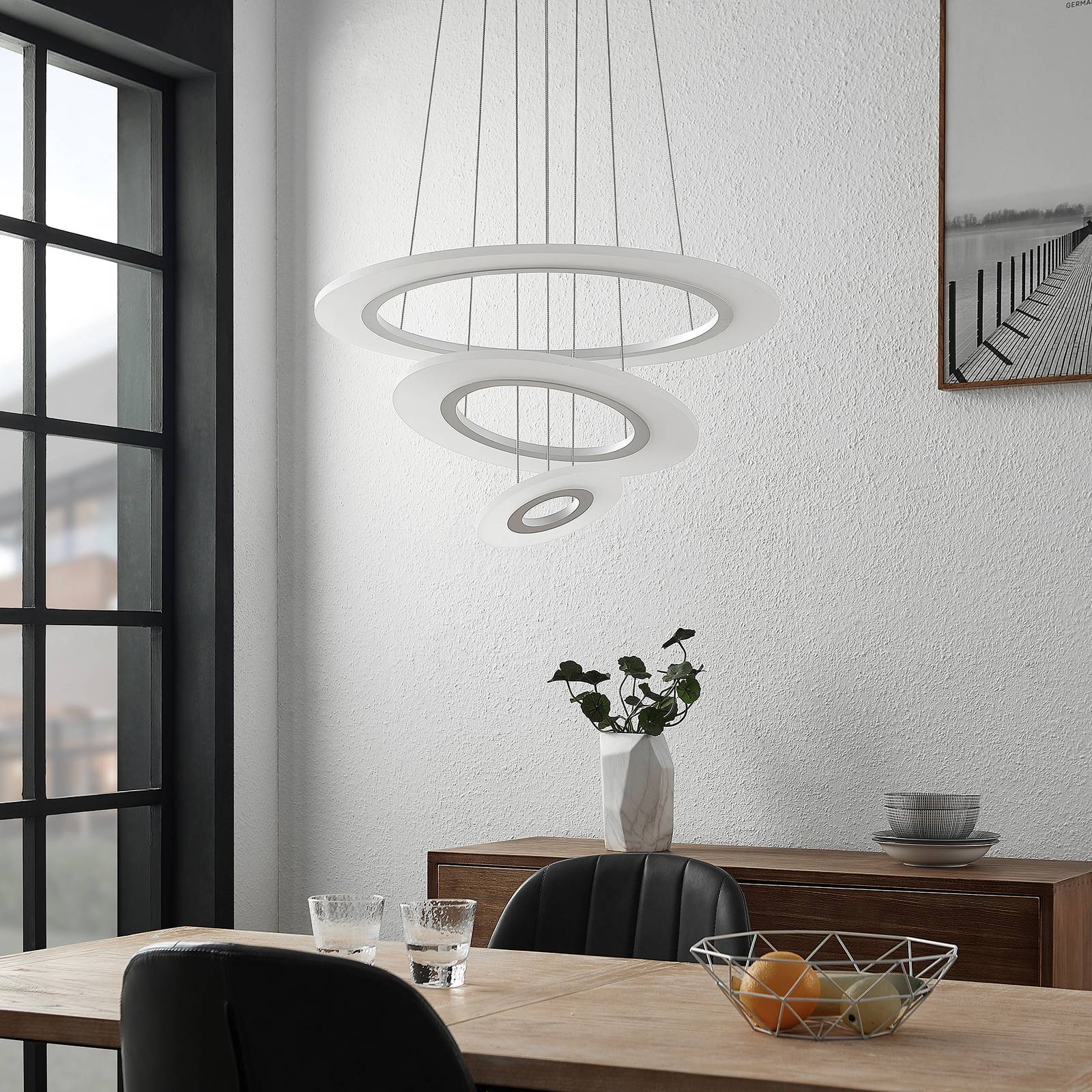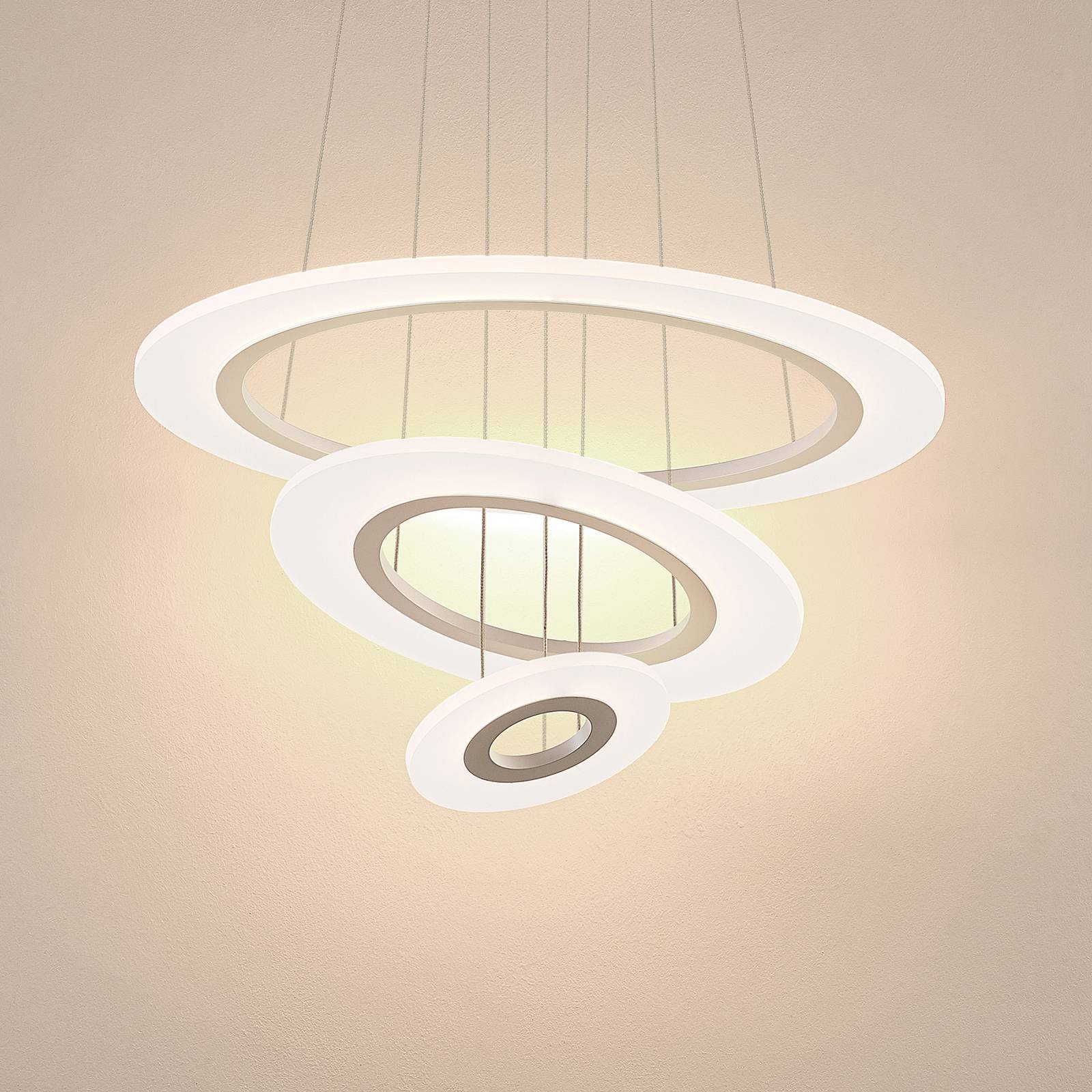 Lampada a sospensione a LED Amisu con tre anelli illuminati L'apparecchio a sospensione a LED Amisu ha un design moderno e interessante. L'apparecchio a sospensione rotondo può essere montato a piacere, perché la sua campana è costituita da tre anelli ad incastro in metallo bianco opaco e acrilico, ognuno dei quali è sospeso alla calotta rotonda su cavi d'acciaio e può essere disposto a qualsiasi angolazione, in modo da poter dare all'apparecchio una forma individuale durante l'installazione. In ognuno degli anelli sono installati dei LED bianchi caldi, che creano un effetto di luce uniforme grazie all'acrilico satinato. Per modificare individualmente l'emissione luminosa, la luminosità dell'apparecchio può essere commutata su tre livelli di luminosità con l'interruttore a parete esistente. 1 x commutazione - 100 %, 2 x commutazione 55 %, 3 x commutazione 20 %, 4a commutazione - off