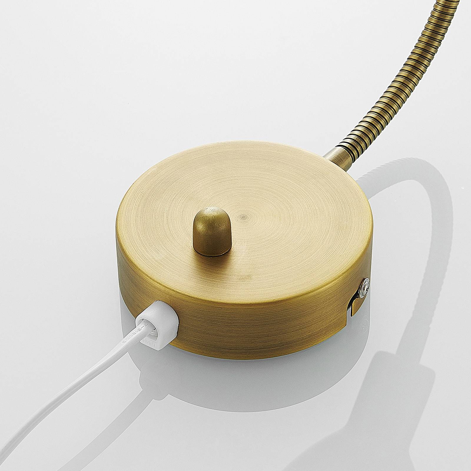Lampada da parete Amrei in metallo color ottone antico con dimmer integrato Amrei è un'applique dotata di grande flessibilità. Ciò è dovuto principalmente al fatto che il braccio della lampada è flessibile e può essere orientato in tutte le direzioni possibili. Oltre all'illuminazione diretta, che può essere utilizzata ad esempio per la lettura, è possibile scegliere anche un'illuminazione più indiretta, ovvero quando il paralume è diretto verso l'alto. La luminosità può essere regolata in base alle esigenze, in quanto è presente un dimmerotante direttamente sulla staffa rotonda a parete, che può essere utilizzato anche per accendere o spegnere l'applique. L'applique Amrei viene fornita con un cavo di alimentazione preassemblato. È di colore bianco e lungo 2 metri.