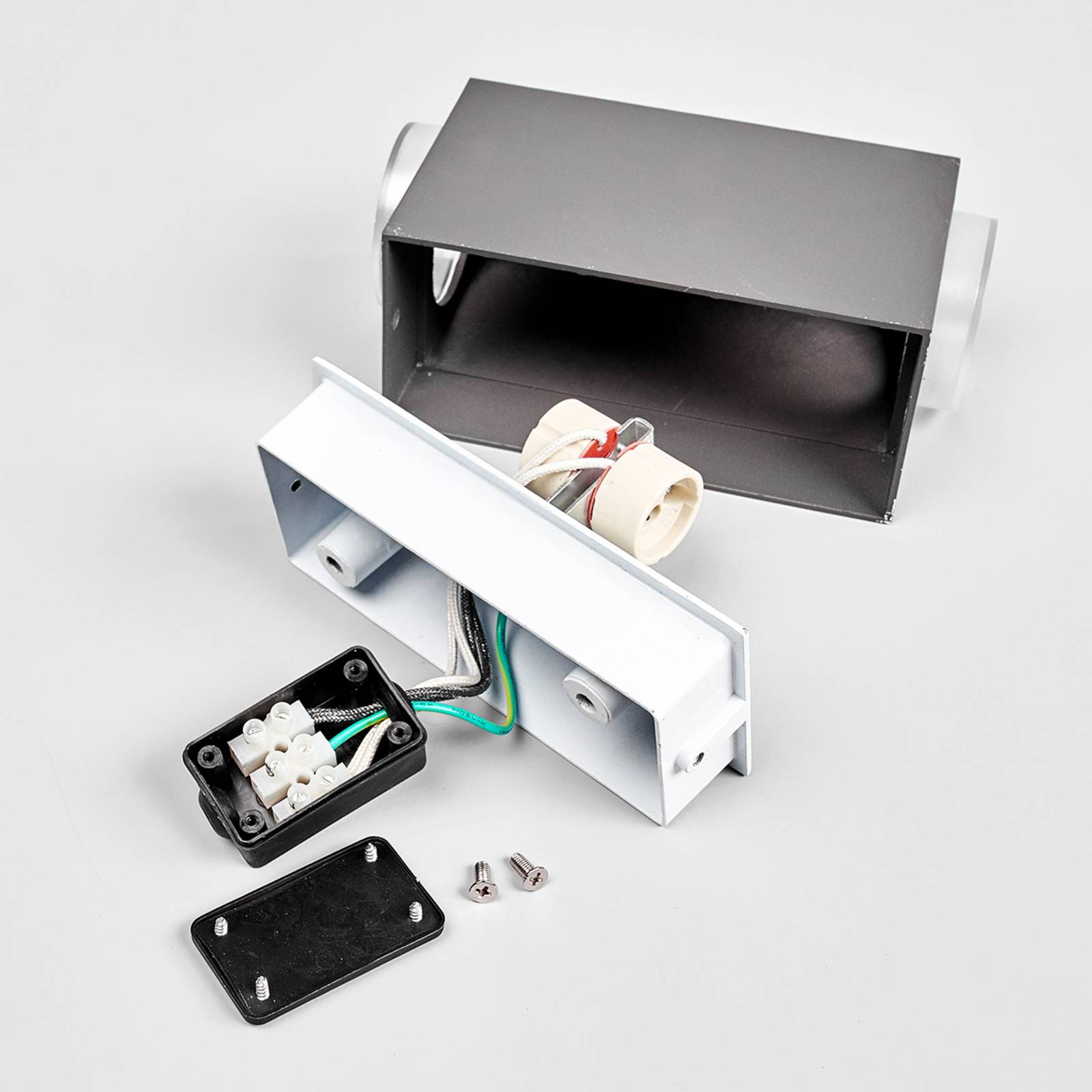Jovan - applique da esterni grigio scuro Questa variante dell'applique Jovan da esterni funziona con due lampade ad attacco GU10, una in alto e l'altra in basso, per emissione bilaterale. Il corpo di alluminio è verniciato in colore grigio scuro. I due portalampada sono coperti da rifrattori di plastica che completano il design con armonia.