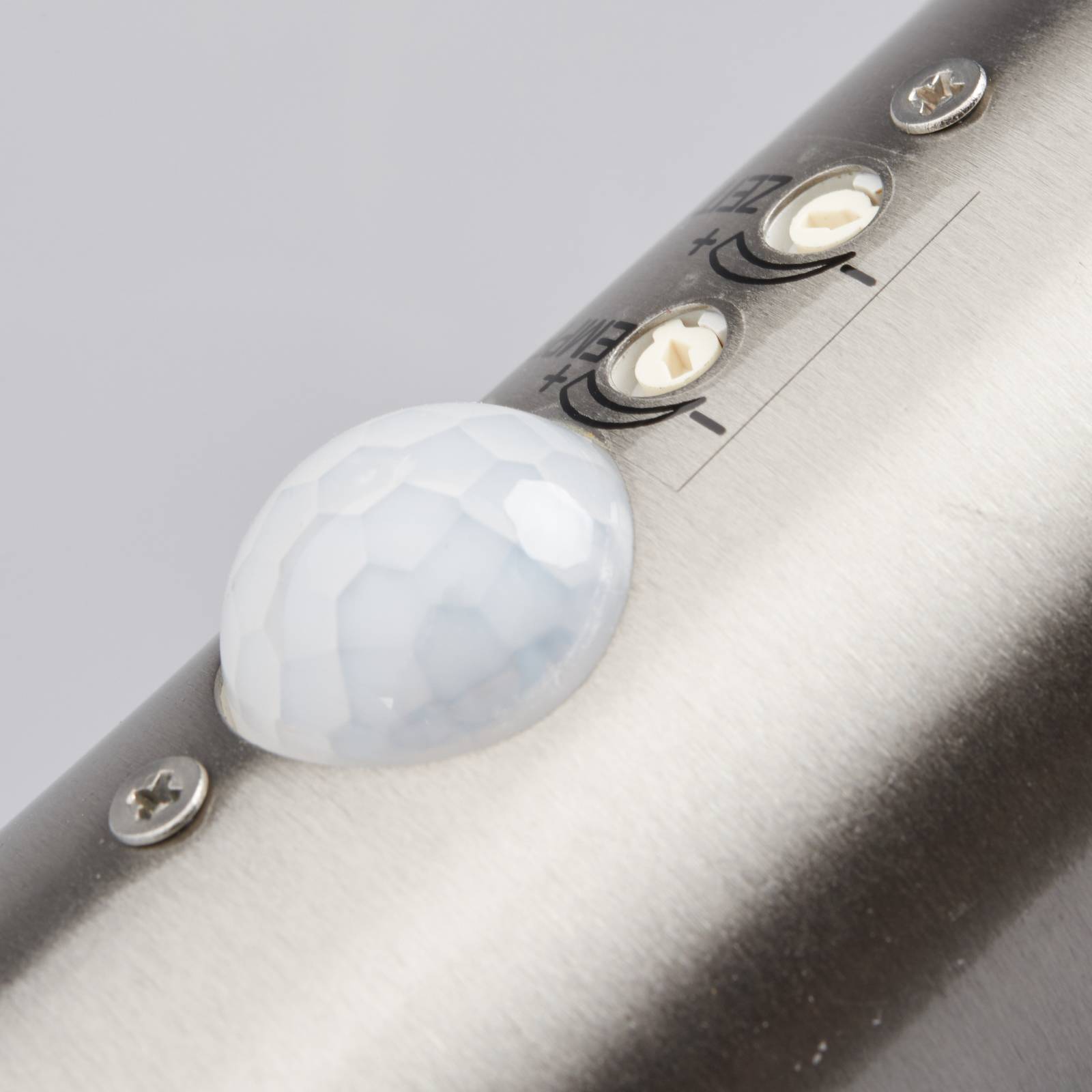 Applique da esterno a LED Lillie in un bellissimo look in acciaio inox Questa applique da esterno a LED è dotata di un rilevatore di presenza, che ovviamente aumenta la comodità per l'utente. Ciò significa che non è più necessario cercare un interruttore che potrebbe trovarsi all'interno della casa, ma si può fare affidamento sul rilevatore di presenza per reagire in modo affidabile alla comparsa di persone accendendo l'applique da esterno. Il rilevatore di presenza può essere modificato come segue: La durata della luce può essere regolata (5s-4min) e la portata può essere variata (2-8m). L'angolo di rilevamento è di 90 gradi. Il paralume in acciaio inox è leggermente a forma di cupola ed emette la luce verso il basso in 2 punti, in modo da essere percepita come particolarmente piacevole - perché indiretta. L'aspetto dell'acciaio inossidabile è molto moderno e dimostra un'eleganza particolare, che si rivela in un ambiente contemporaneo.