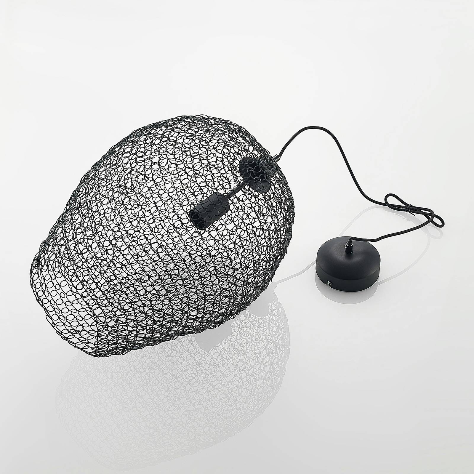 Lampada a sospensione nera Benja con schermo in ottica a rete Benja è un elemento di illuminazione da vedere, che non ha un paralume ordinario, ma uno traslucido, che è fatto di una specie di rete metallica. Questo può evocare associazioni con cotte di maglia e armature simili, ma la cosa principale è naturalmente che il risultato è una lampada a sospensione decorativa che può segnare con un'immagine luminosa attraente e una forma a maglie piccole, in modo che la luce brilli efficacemente sull'ambiente circostante. La superficie nera della maglia di ferro si adatta a molti stili e ha un sottile effetto di colore. La lampada E27 rimane chiaramente visibile dall'esterno e dovrebbe quindi essere scelta con una forma decorativa che abbia il classico aspetto a incandescenza. Le lampade a filamento e rustiche a LED sono quindi particolarmente raccomandate, soprattutto perché consumano poca energia.