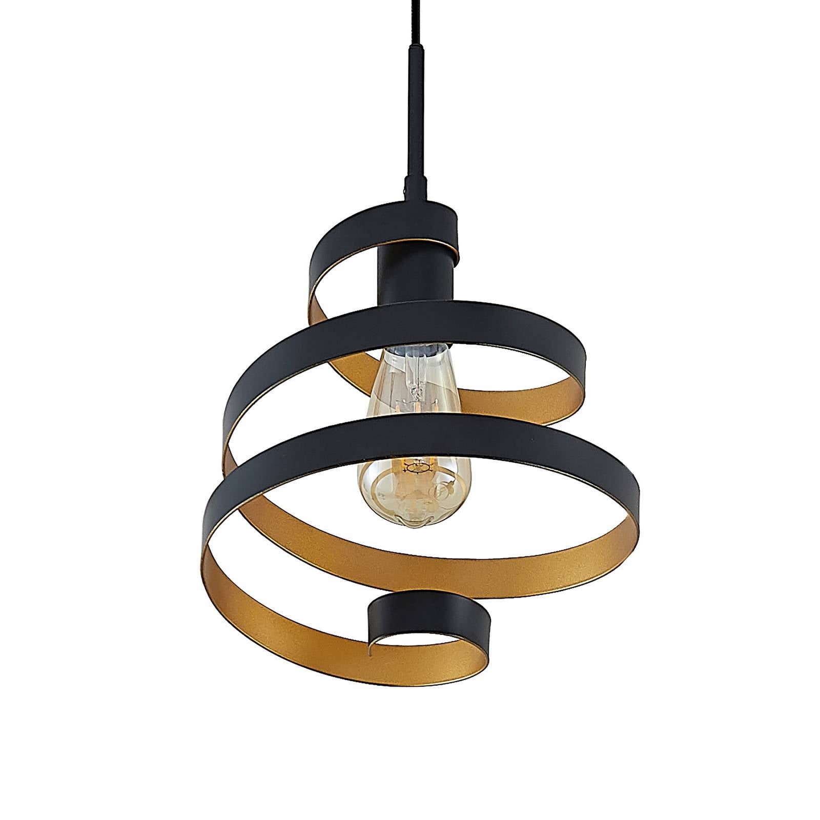 Lampada a sospensione di design nero-oro Colten con paralume a spirale Colten convince con un look che vale la pena di vedere, perché le tre tonalità non sono esattamente ordinarie, ma piuttosto accattivanti con le loro fasce metalliche attorcigliate a spirale, che tuttavia sono molto permeabili, in modo che la vista degli illuminanti sia sempre libera. Di conseguenza, le lampade da utilizzare possono essere considerate parte integrante del look e devono quindi essere scelte con cura. Tutte le sorgenti luminose con lampadine in vetro si adattano quindi particolarmente bene e si possono utilizzare anche lampade a filamento o rustiche a LED con un colore della luce particolarmente caldo per creare un quadro luminoso caratterizzato da un'atmosfera accogliente. Inoltre, le strisce metalliche di Colten hanno una finitura dorata all'interno e riflettono quindi la luce in modo particolarmente bello e accogliente. L'apparecchio può essere montato ben al di sopra di un tavolo, sia in salotto sopra il tavolino, sia in cucina o in sala da pranzo come illuminazione della zona pranzo.