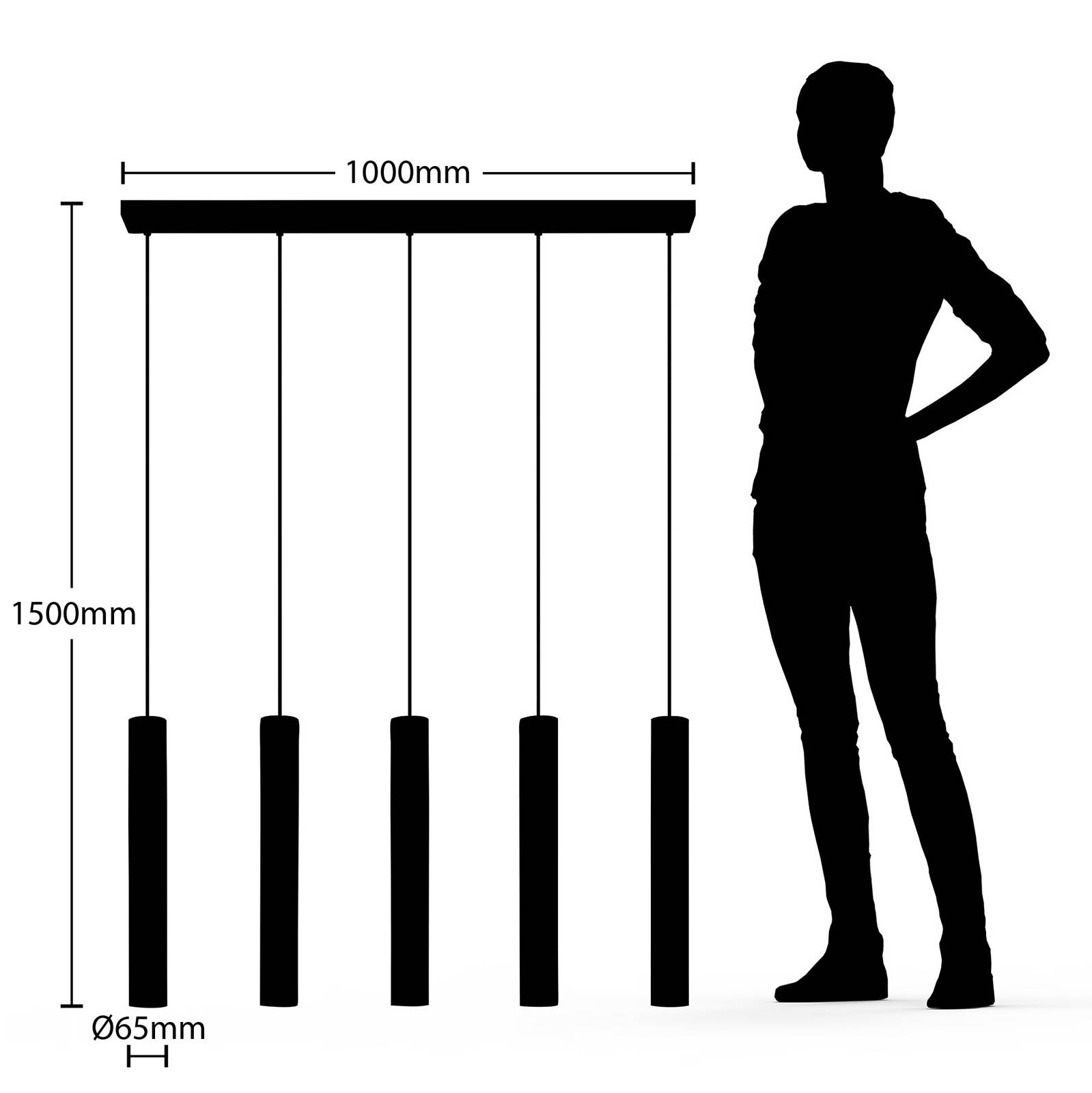 Pendente a cinque luci Concretto con lunghe ombreggiature in calcestruzzo Cinque ombreggiature in cemento armato, allungate e sottili, sono allineate lungo la lunga calotta metallica dell'apparecchio a sospensione Concretto. Sono appesi a diverse altezze e sono smussati all'estremità inferiore in modo che la luce non venga emessa solo verso il basso ma anche parzialmente lateralmente. La lampada a sospensione Concretto è una fonte di luce ideale per un bancone in cucina o un lungo tavolo nella sala da pranzo di ambienti dal design moderno che emana un tocco di carattere vintage.