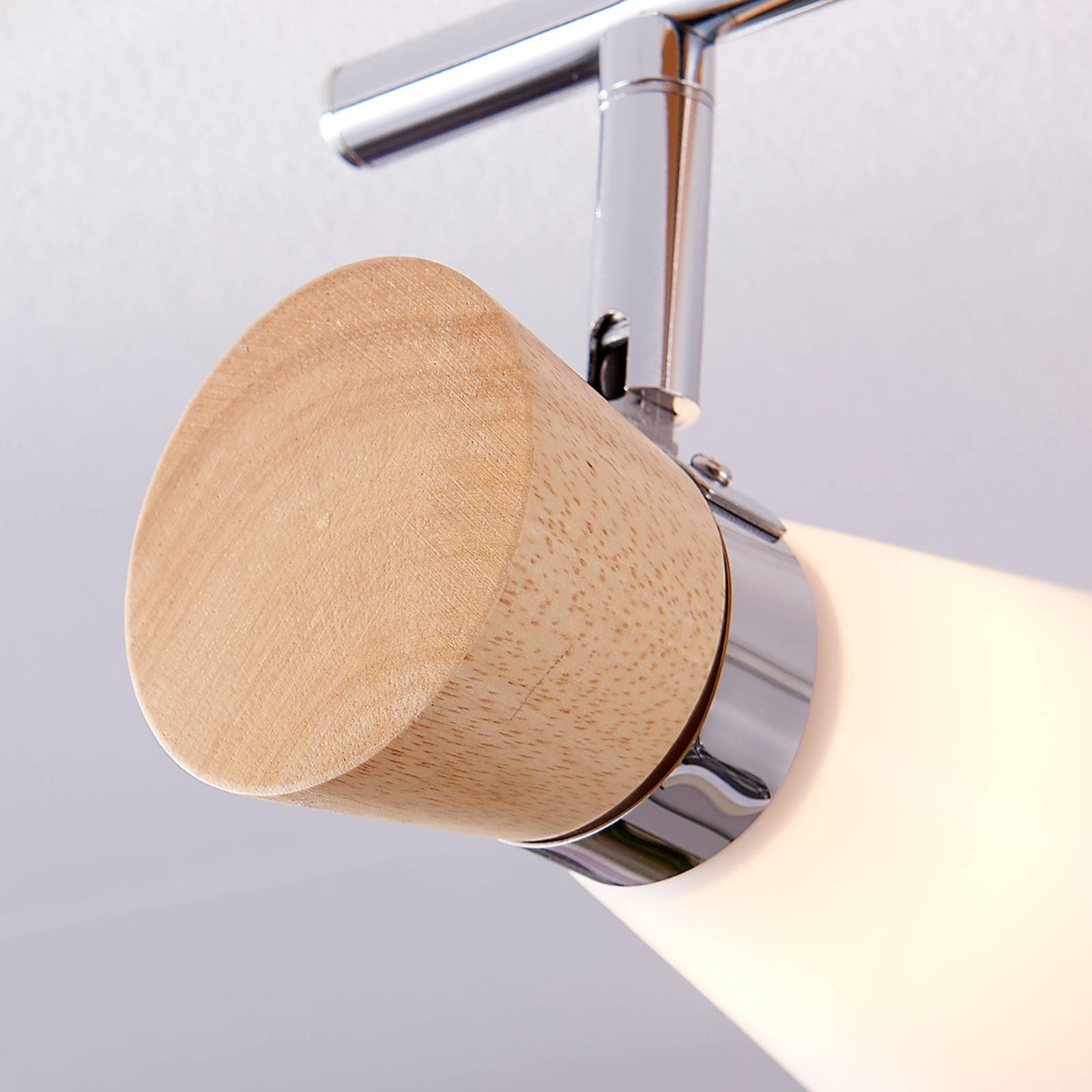 Attraente lampada di legno Vivica con schermi di vetro bianco a calice Vivica è una lampada che sa dare un tocco di naturalezza ad ogni parte della casa, sia essa il salotto, la camera da letto o il corridoio. Infatti è costruita con diversi dettagli di legno chiaro con venature, visibili sia sugli schermi che sul supporto. Gli schermi di vetro bianco e gli elementi posteriori di legno sono separati otticamente da un anello cromato che ne accentua l'eleganza. I due schermi possono essere ruotati e inclinati in modo da puntare la luce nella direzione preferita. Inoltre Vivica si fissa senza problemi sia sul soffitto che sulla parete, sempre creando un'efficace illuminazione d'accento.