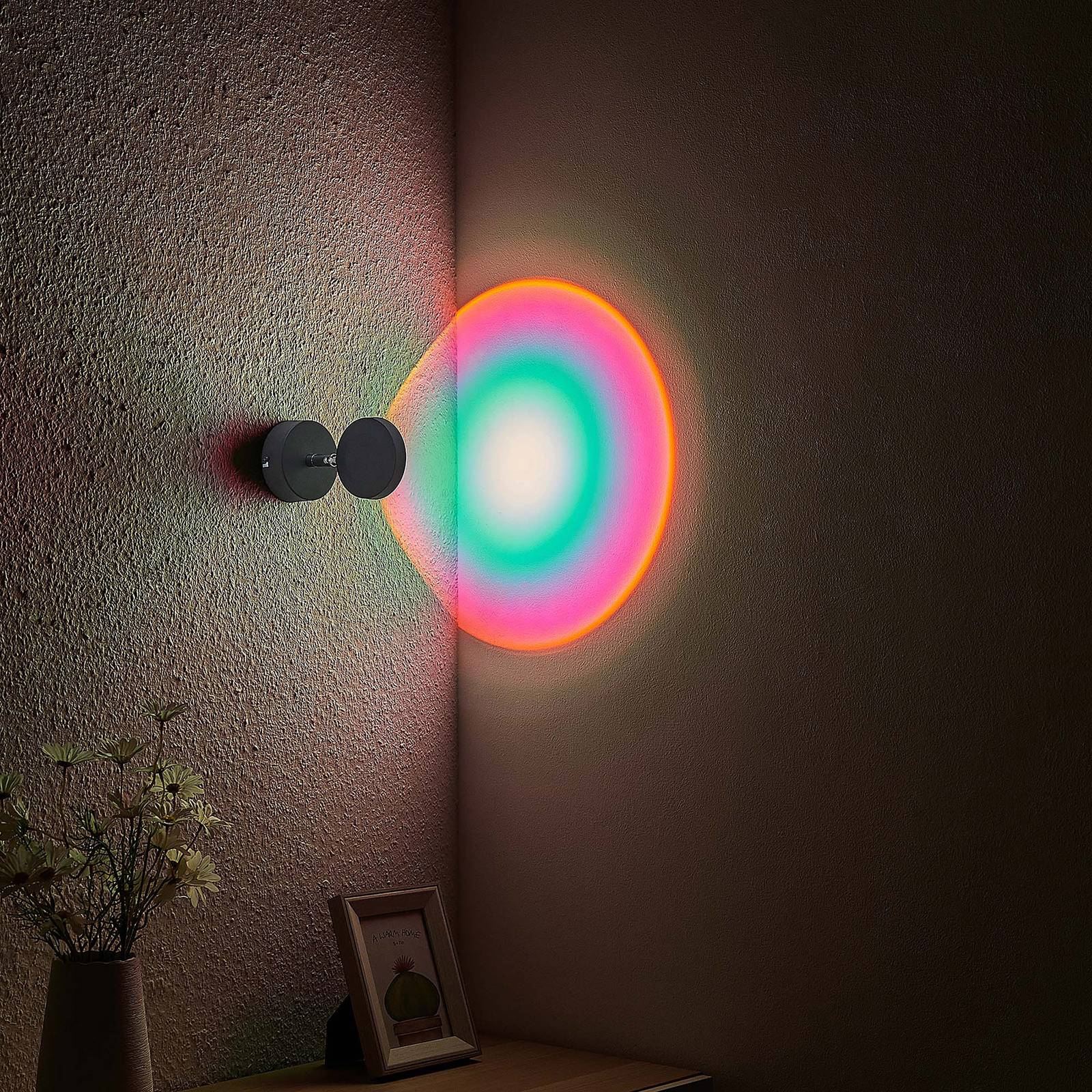 Lampada da parete a LED nera Edonita con lente per una luce dall'effetto chiaramente sagomato Questa lampada da parete a LED ha un alloggiamento in metallo nero e una lente di vetro che produce una luce nettamente sagomata. In questo modo si creano dei bellissimi accenti con effetti colorati, che vale la pena vedere. Poiché la testa della luce è girevole, puoi decidere tu stesso in quale direzione la luce deve puntare. Sul muro, questo si riflette in un modo molto bello, che è molto attraente e visibile da lontano.