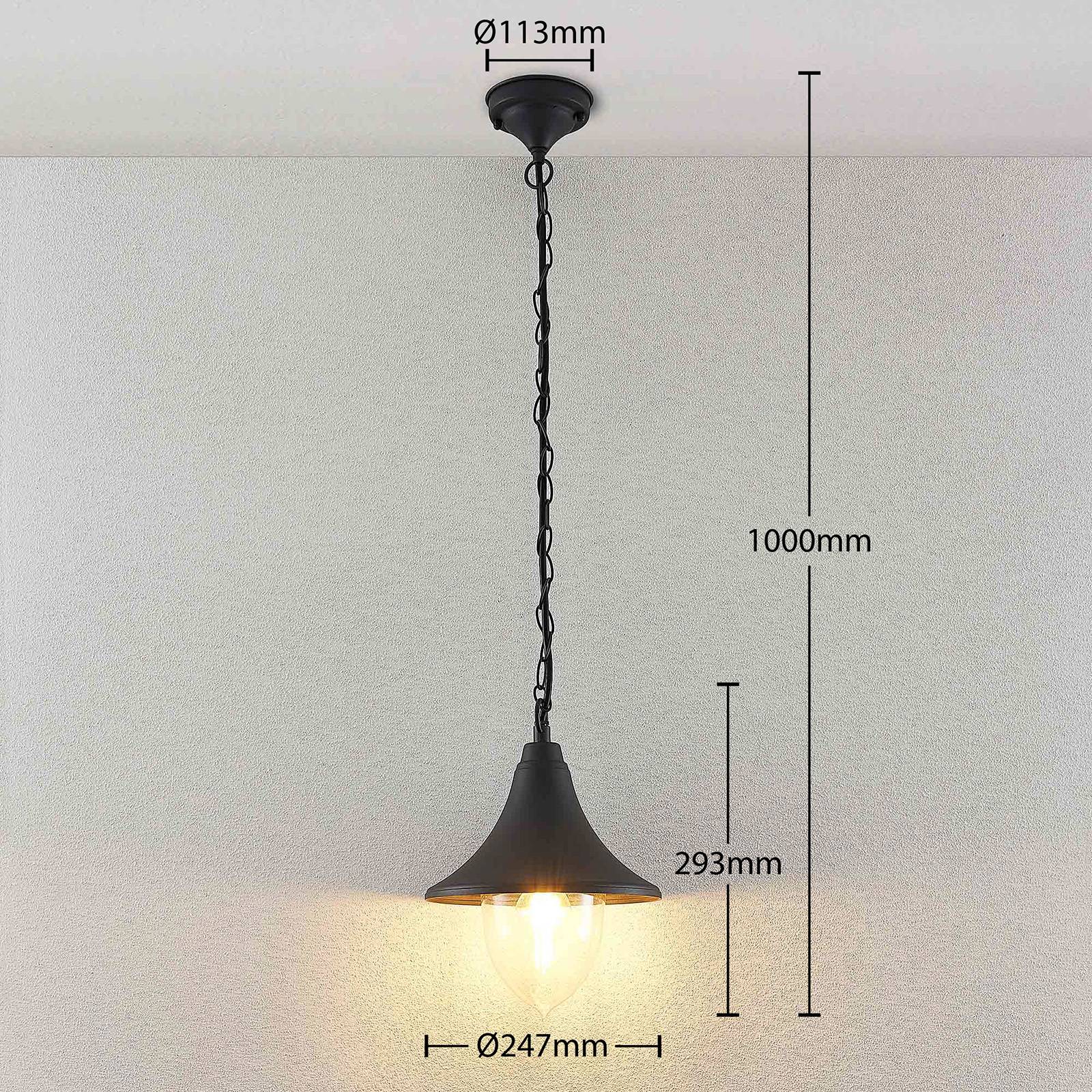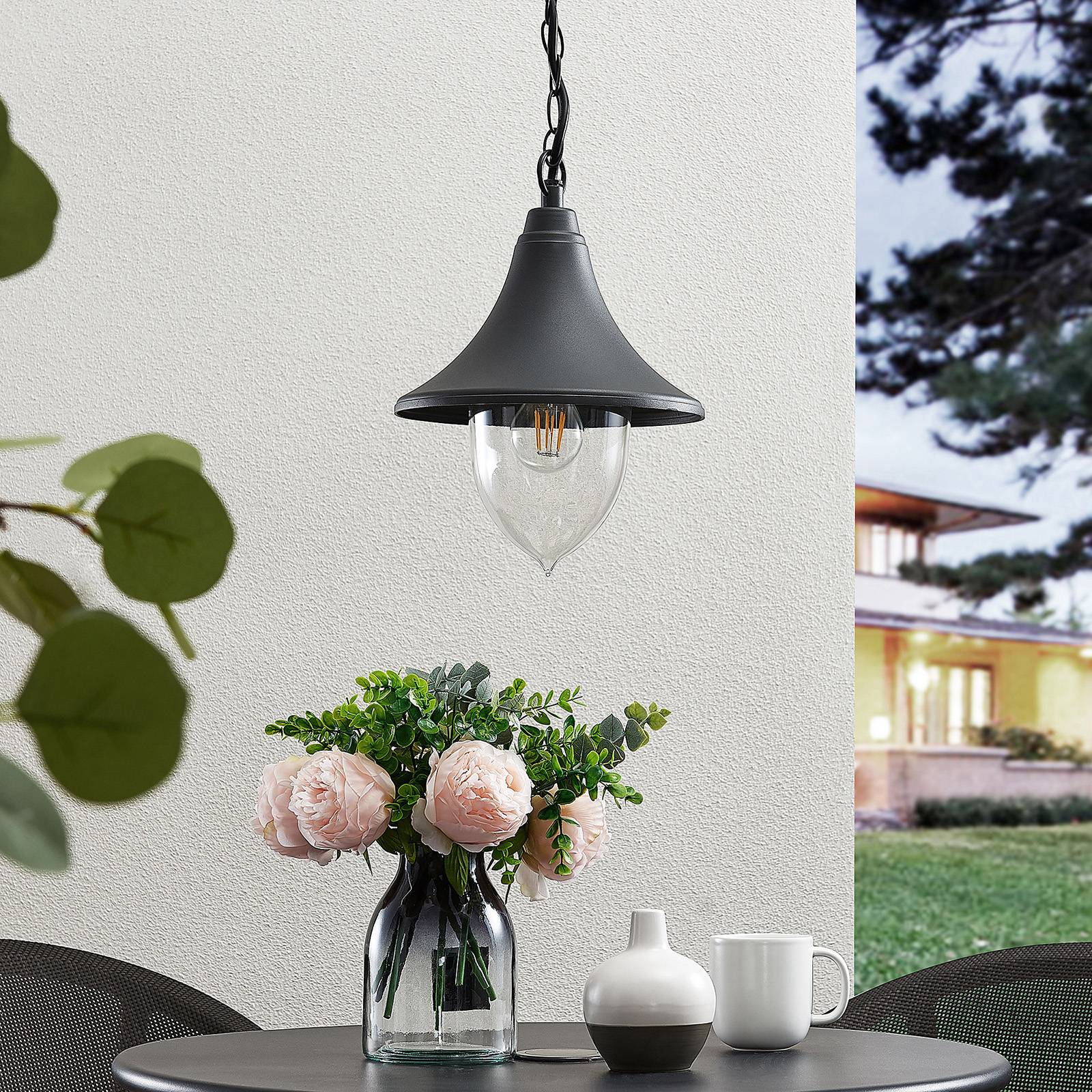Per zone all'esterno protette da tettoie - lampada a sospensione Edric Il telaio che trattiene il paralume trasparente ha la forma di un arco a imbuto rovesciato in cui trova posto il portalampada ad attacco E27, protetto da un paralume di plastica a goccia. Questo bel design non manca di un certo fascino nostalgico ed è ideale per illuminare zone all'esterno protette da tettoie. Per esempio una terrazza coperta, una veranda o un pergolato. I materiali sono resistenti all'acqua marina, pertanto la lampada si può installare senza problemi anche in zone costiere.