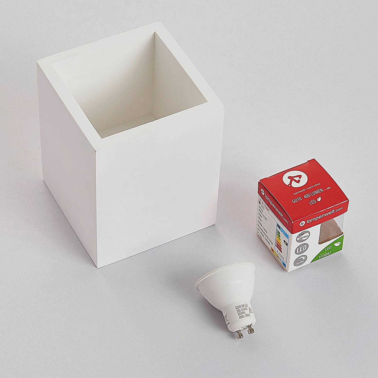 Downlight Natalie in gesso dal design semplice Natalie è un downlight angolare di forma quadrata, dall'aspetto molto semplice. Dal punto di vista visivo, va menzionato un altro aspetto: la superficie in gesso del downlight può essere verniciata, se necessario, o addirittura dipinta con un motivo individuale. L'apparecchio è dotato di lampadine E14.