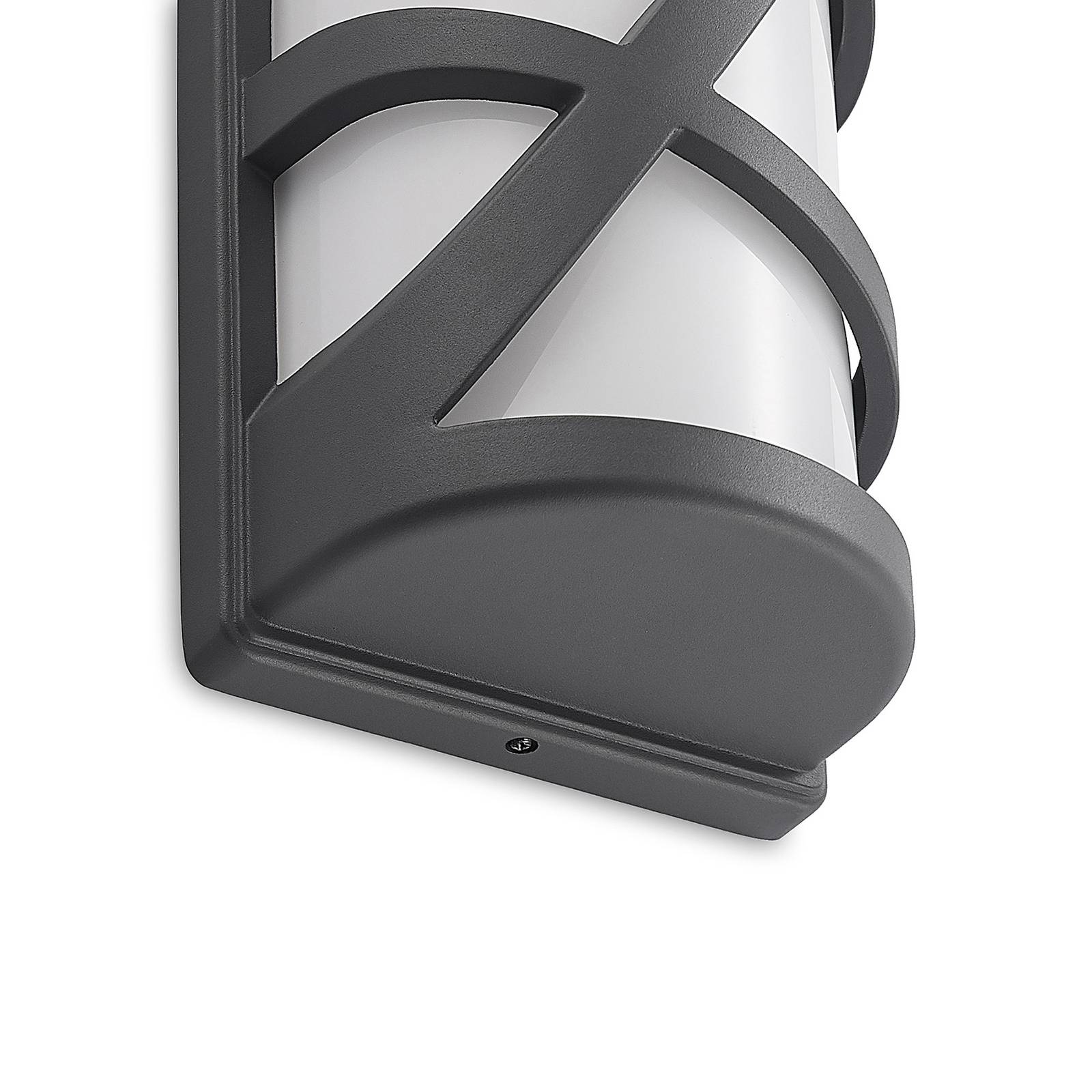 Lampada da parete esterna Femani per illuminare l'ingresso o la terrazza L'applique da esterno Femani colpisce per il suo look elegante, che può essere integrato senza sforzo in qualsiasi ambiente moderno. Sulla terrazza, sul balcone o nell'area d'ingresso - l'apparecchio Femani fa sempre una bella figura. Il suo alloggiamento è in alluminio e ha una finitura grigio scuro. Il paralume protegge la presa E27 dietro di esso ed è fatto di plastica bianca opaca. Questo ha l'effetto collaterale che il paralume agisce come un diffusore e distribuisce la luce in modo uniforme.