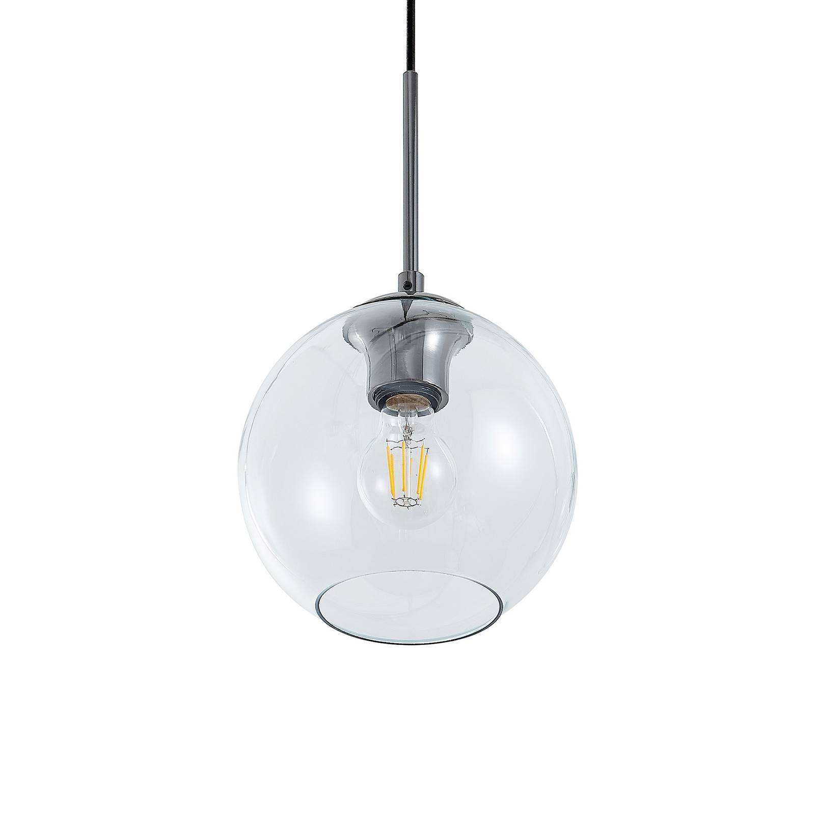 Lampada a sospensione Firano con tre paralumi in vetro La lampada a sospensione Firano ha un supporto a soffitto allungato in acciaio a cui sono attaccati tre cavi tessili. I paralumi sono progettati in una classica forma sferica e realizzati in vetro. La raffinata combinazione di materiali tra il metallo robusto e il vetro trasparente è molto elegante sul soffitto. L'apparecchio può essere usato con buon effetto sia sopra un tavolo da pranzo che sopra un bancone.