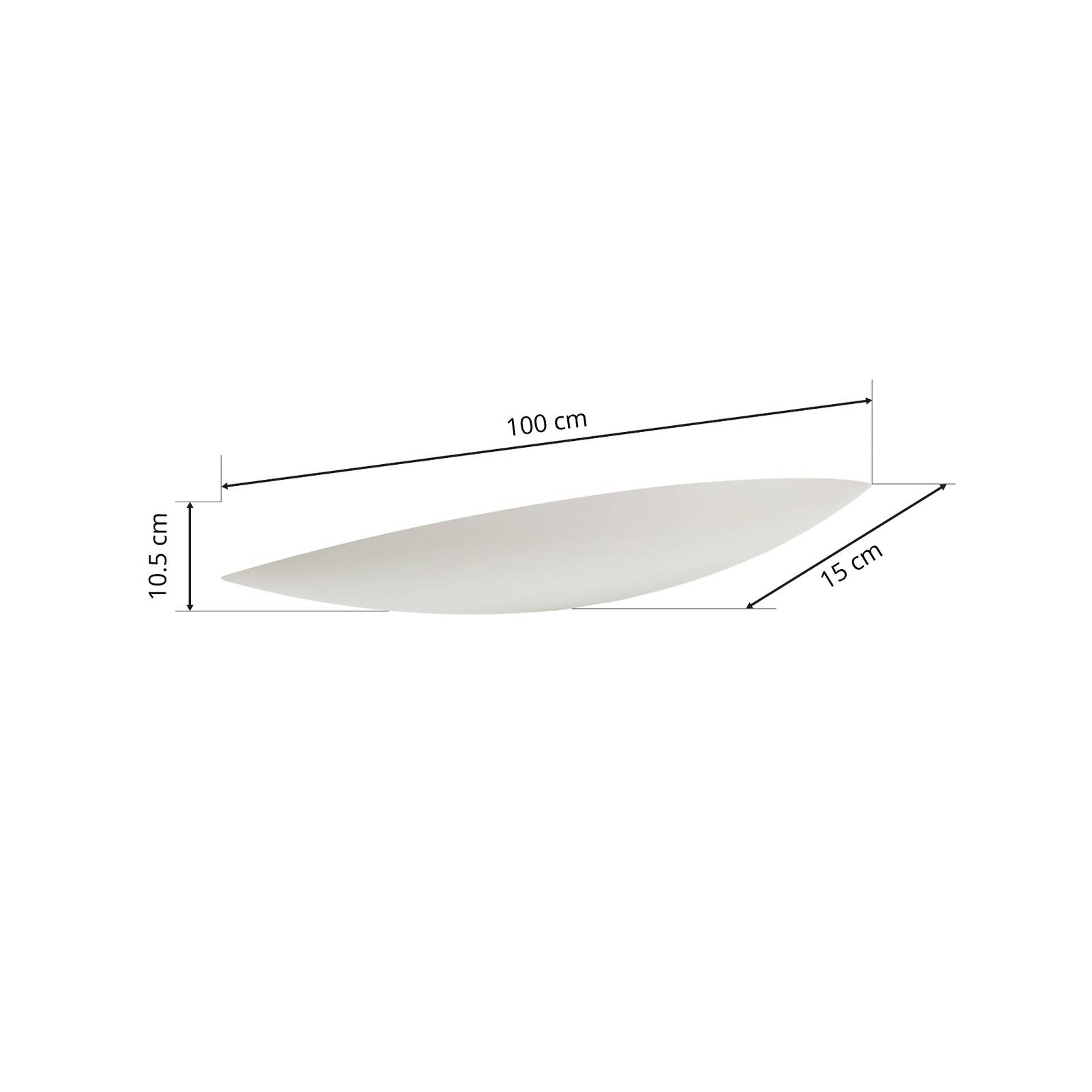 Elegante applique di gesso Tommi, di grossa dimensione Le applique di gesso sono sempre più apprezzate. Di solito però presentano dimensioni molto compatte. Non è per nulla il caso di Tommi, un'applique larga ben 1 metro. Vi trovano posto 4 lampadine con attacco E14. La costruzione è quella di un wallwasher, vale a dire che la luce fuoriesce unicamente verso l'alto e illumina l'ambiente in forma solo indiretta. Pertanto è garantita un'atmosfera decisamente accogliente e suggestiva. Questa lampada di gesso viene fornita con la superficie lasciata bianca, armoniosa e compatibile con ogni ambiente. Qualcuno però potrebbe pensare che tutto questo bianco sia monotono. In tal caso non c'è problema, visto che il gesso è un materiale che si può pitturare con facilità. Le opzioni sono molte, basta prendere in mano il pennello e lasciar correre la fantasia. Per esempio si può intonare il colore dell'applique a quello della parete. Con i colori identici l'applique si fonderà con la parete diventandone parte integrante. Oppure si sceglie un colore diverso, analogo a quello della parete o magari in assoluto contrasto che crea un colpo d'occhio. E se la tinta unita riesce ancora monotona, per quanto colorata, i più creativi potranno dipingere il gesso come un quadro, con motivi e fantasie di loro ideazione. Il risultato sarà originale sia copiando un modello che inventando un nuovo disegno.
