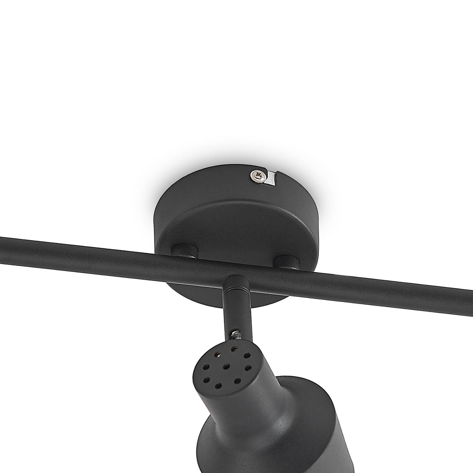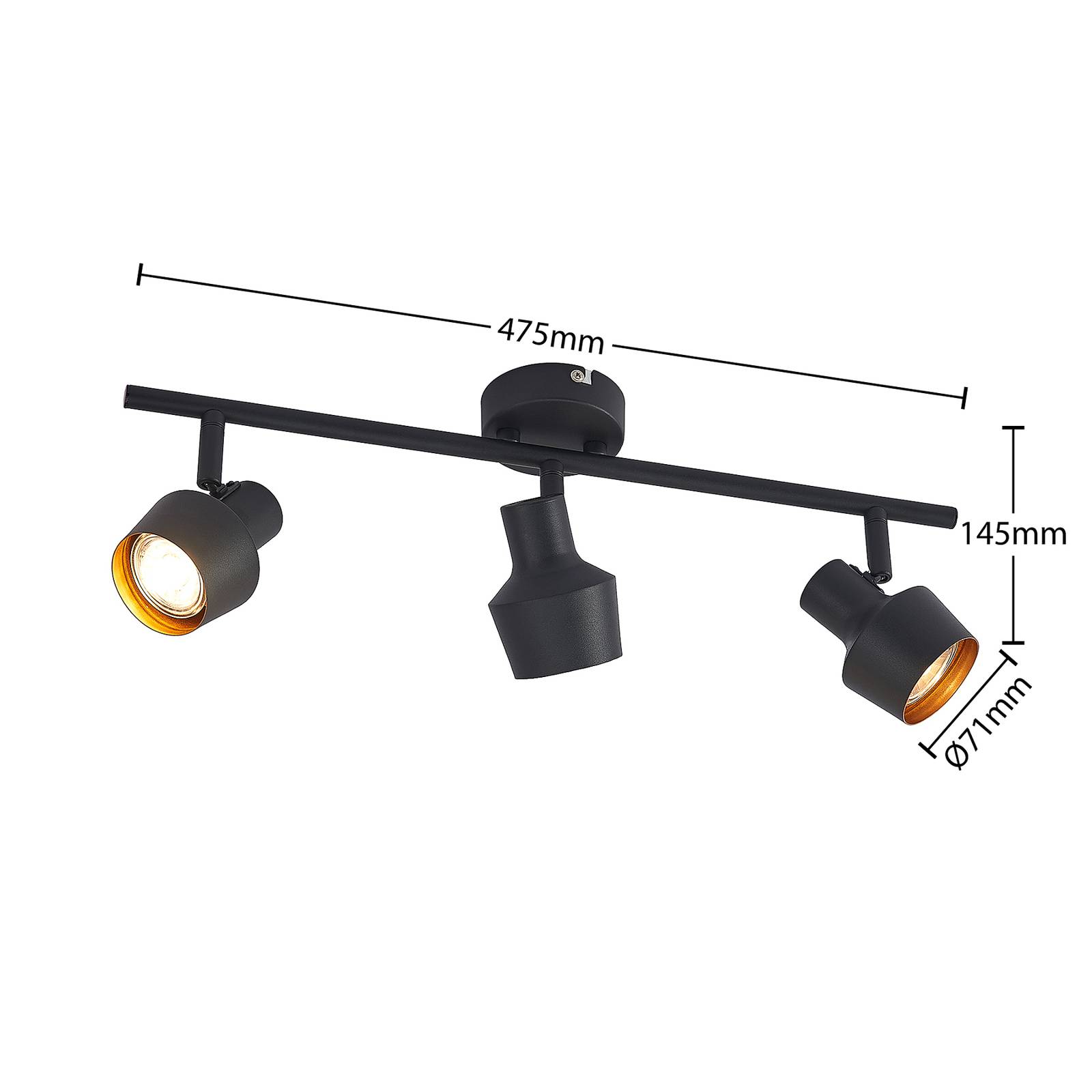 Faretto da soffitto Ihaia in acciaio con cornice allungata in nero Il sottile e moderno spot da soffitto Ihaia convince con il suo carattere discreto e il suo ampio design. Si compone di acciaio nero e ha tre paralumi, che siedono su un montante montato orizzontalmente. L'interno di queste tonalità è rivestito di un oro sorprendente, circondando le lampadine GU10 da utilizzare e facendo apparire la loro luce più intensa. Con il suo aspetto semplice, il faretto da soffitto Ihaia si integra bene in un'ampia varietà di stili interni e, grazie al suo design allungato, trova un posto perfetto in una zona d'ingresso, ma fa anche una figura super in altre stanze. L'armoniosa combinazione di colori nero e oro crea un contrasto attraente e dà al riflettore quel certo qualcosa.