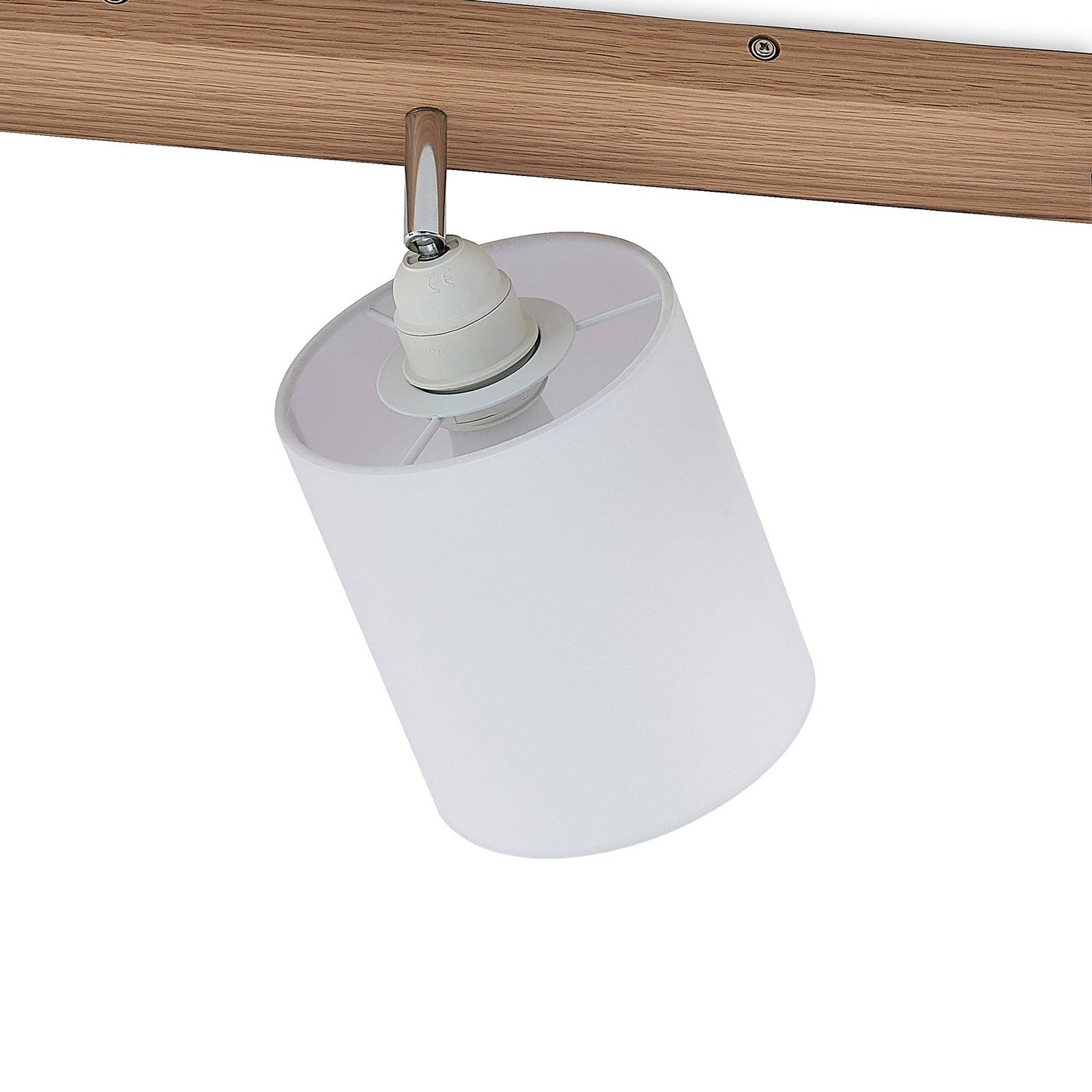Semplice faretto da soffitto Imarin con paralumi flessibili Il faretto da soffitto Imarin si presenta nella sua versione a tre lampade. Ha un supporto a soffitto allungato in legno di quercia, al quale sono fissati i paralumi cilindrici in tessuto bianco. Questa bella combinazione di colori e materiali può essere facilmente integrata in diversi design senza imporsi visivamente. I paralumi possono anche essere ruotati e inclinati grazie a giunti sferici integrati, in modo che l'aspetto dell'apparecchio e l'emissione luminosa possano essere modificati in qualsiasi momento.