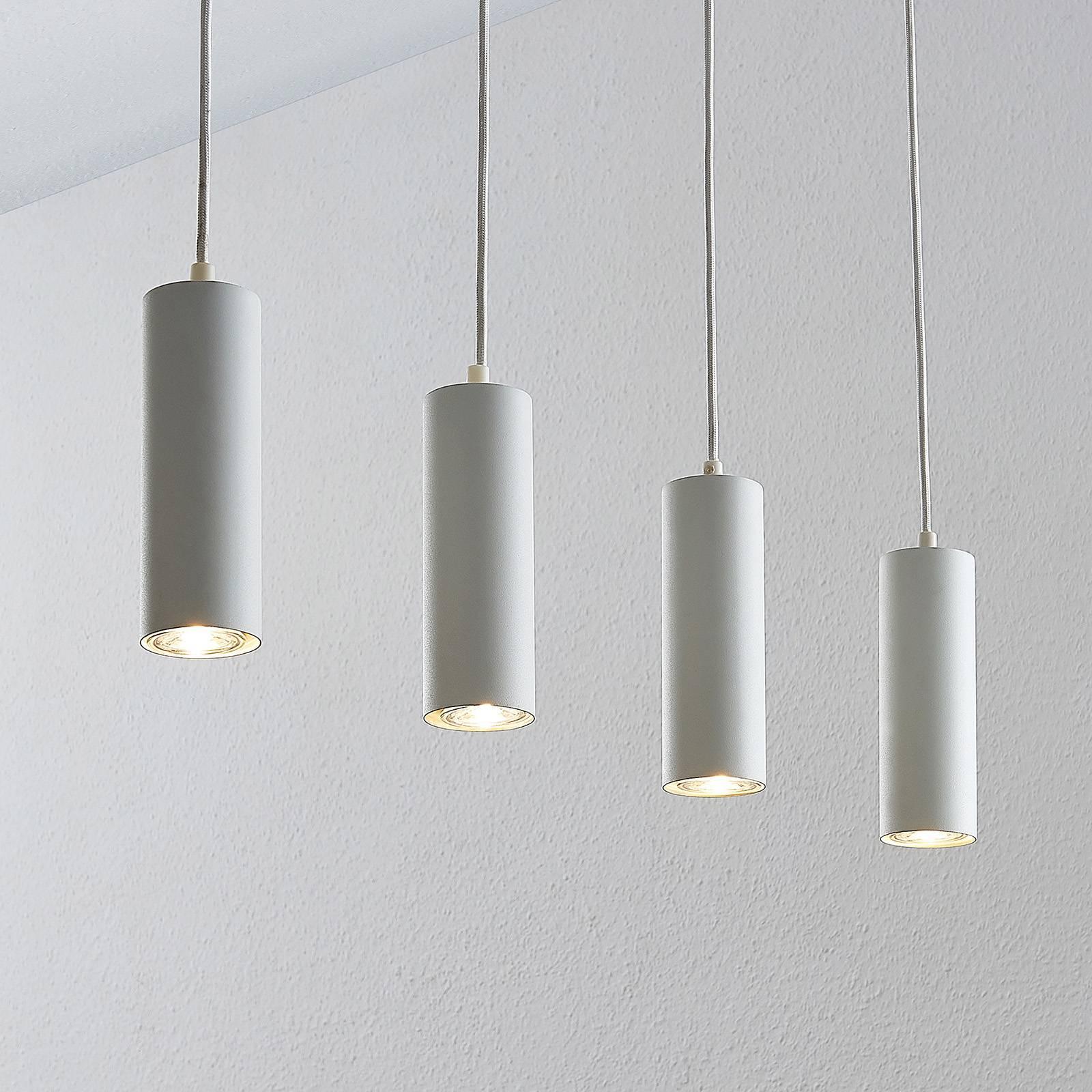 Lampada a sospensione Joffrey a quattro punti luce in bianco La lampada a sospensione Joffrey piace soprattutto per il suo raffinato minimalismo. I quattro lunghi paralumi di forma cilindrica sono allineati. Per questo la lampada a sospensione è perfetta per illuminare un tavolo da pranzo o un bancone. Grazie al design essenziale e alla neutralità del colore, Joffrey armonizza con qualsiasi stile, dal classico al moderno.