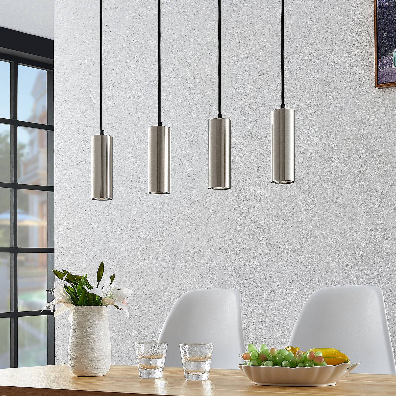 La lampada a sospensione Joffrey dà un tocco di eleganza La lampada a sospensione Joffrey ha quattro tonalità, che appaiono eleganti e moderne allo stesso tempo grazie alla loro forma cilindrica sottile. I paralumi sono realizzati in metallo che, grazie alla sua opacità, fornisce un'illuminazione mirata, particolarmente adatta per illuminare un tavolo da pranzo o un bancone. Con il suo design lineare e il metallo nichelato, l'apparecchio a sospensione Joffrey si integra particolarmente bene con i moderni concetti di ambiente e aggiunge un tocco di stile all'ambiente circostante.