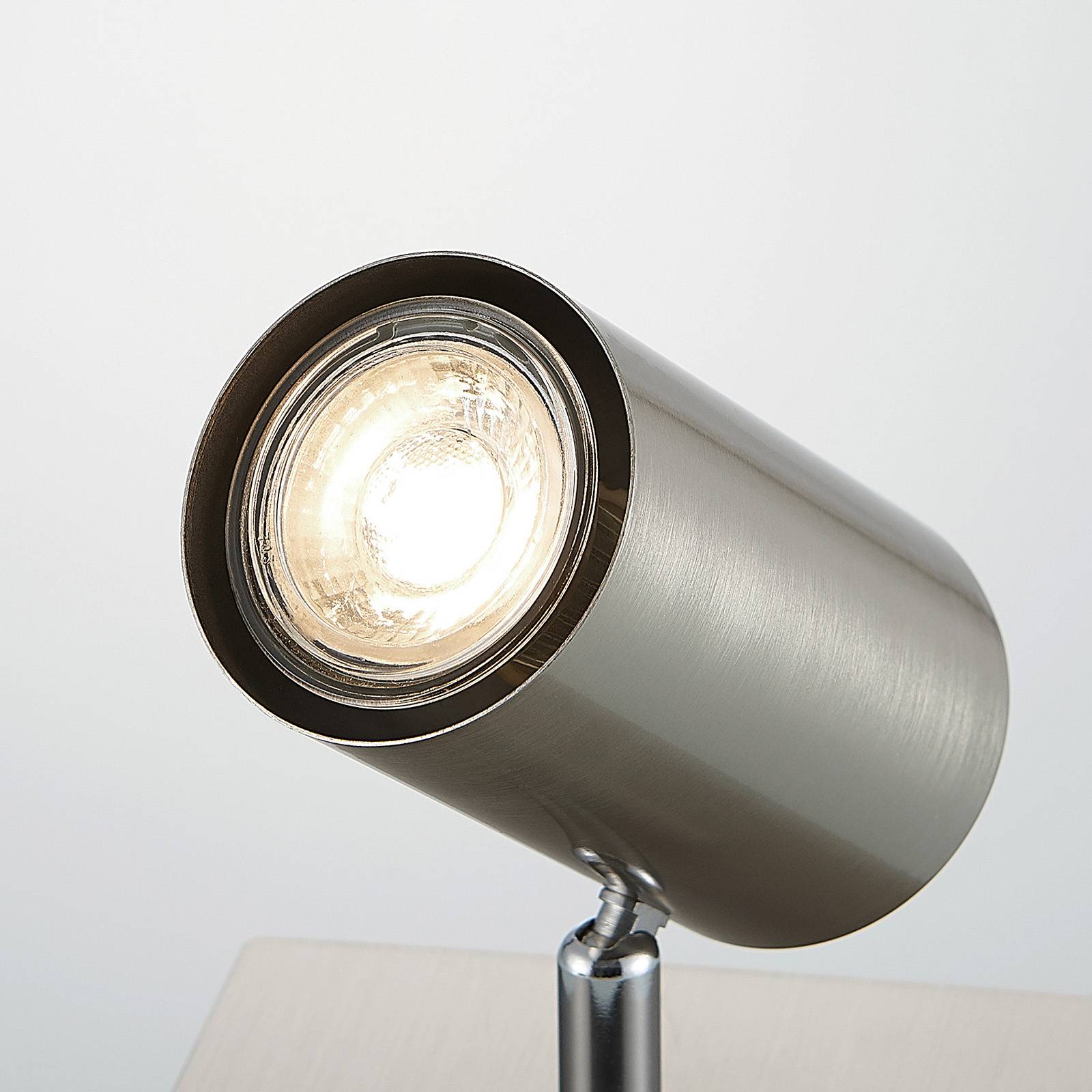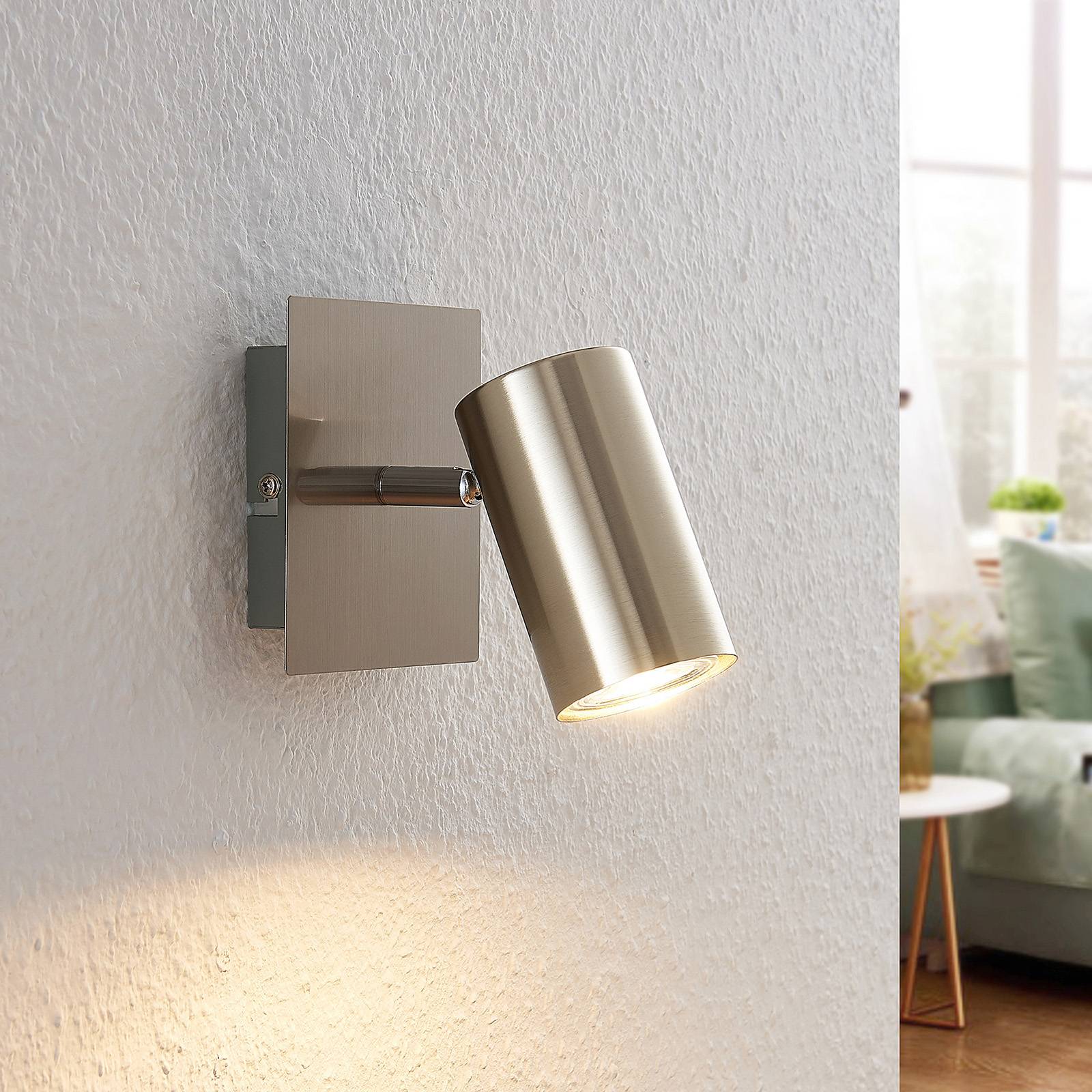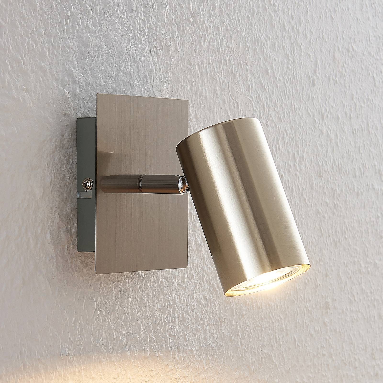 Spot da parete regolabile Joffrey in nichel L'essenziale spot Joffrey in finitura nichel è adatto come luce di lettura o piccolo accento luminoso. Sia il faretto che il fissaggio alla parete sono in metallo con moderna finitura in color nichel. Il faretto ha una testata che si può muovere portando la luce nella direzione che interessa.