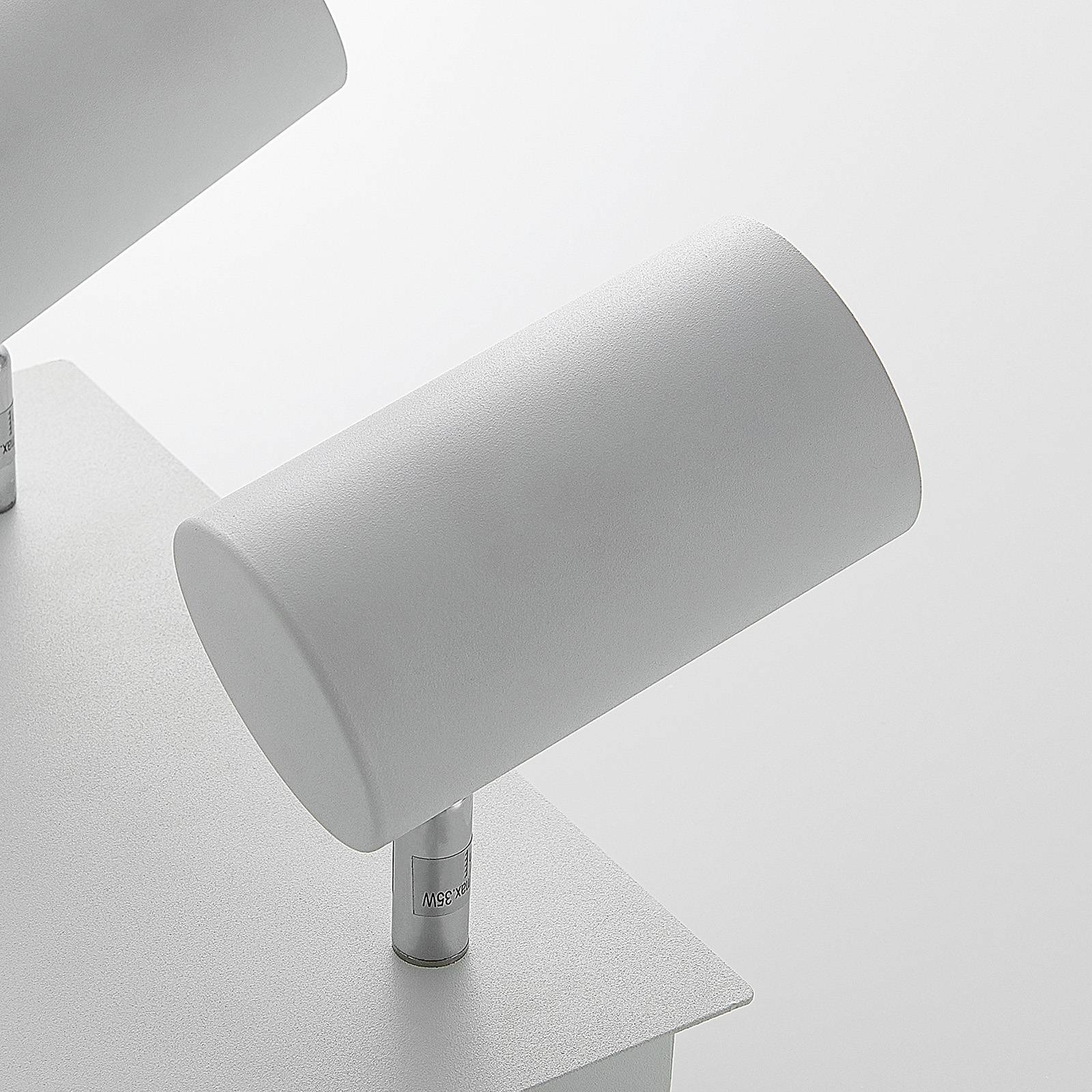Plafoniera quadrata Joffrey in bianco satinato La plafoniera Joffrey ha quattro faretti cilindrici che con la loro luce raggiungono ogni angolo di un ambiente. Infatti le testate snodate si possono variare di posizione portando la luce nella direzione che interessa. Grazie al suo design sobrio, la lampada Joffrey si utilizza con assoluta versatilità.