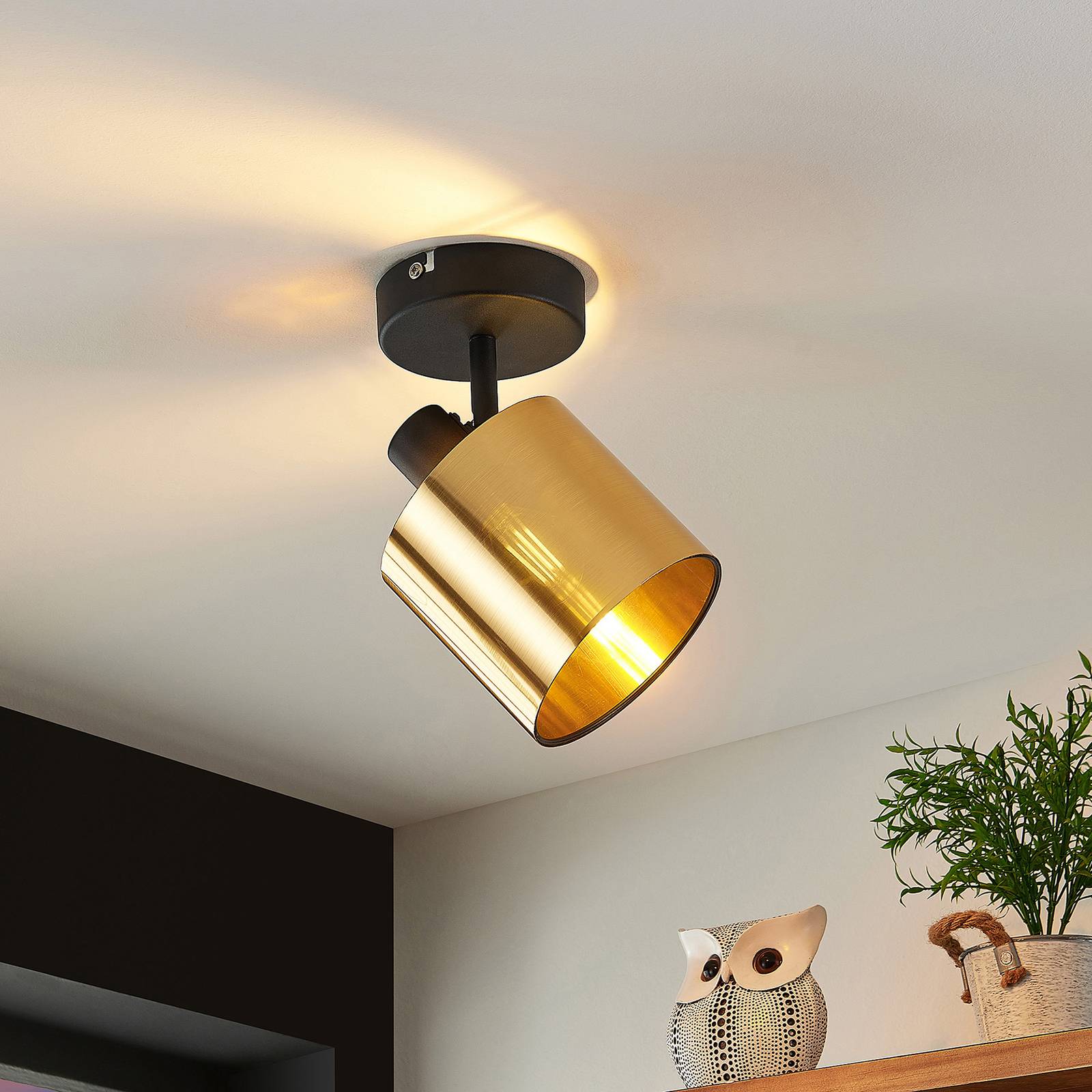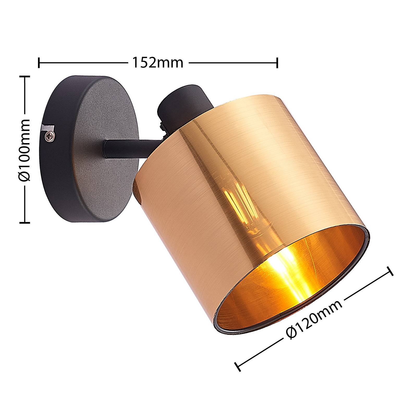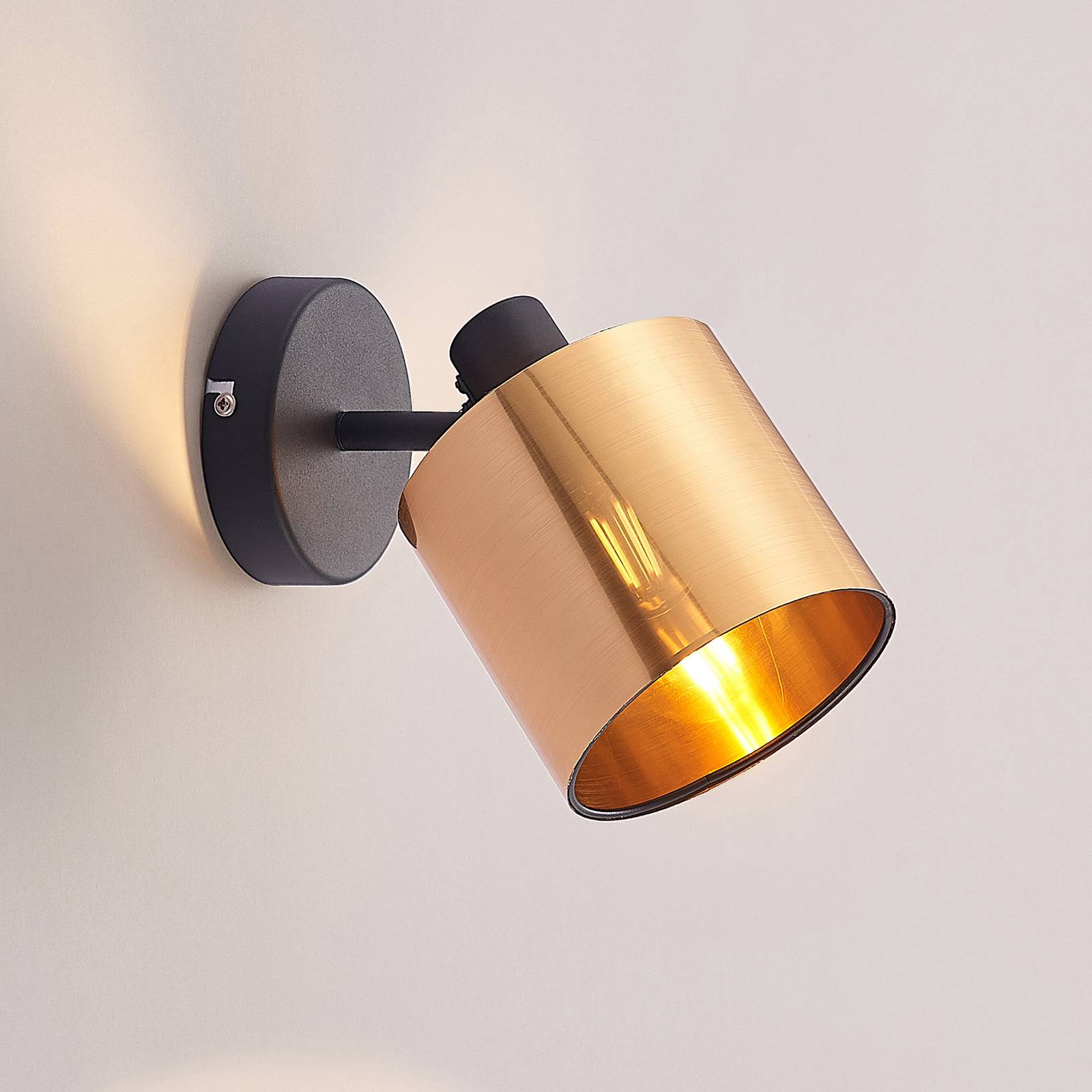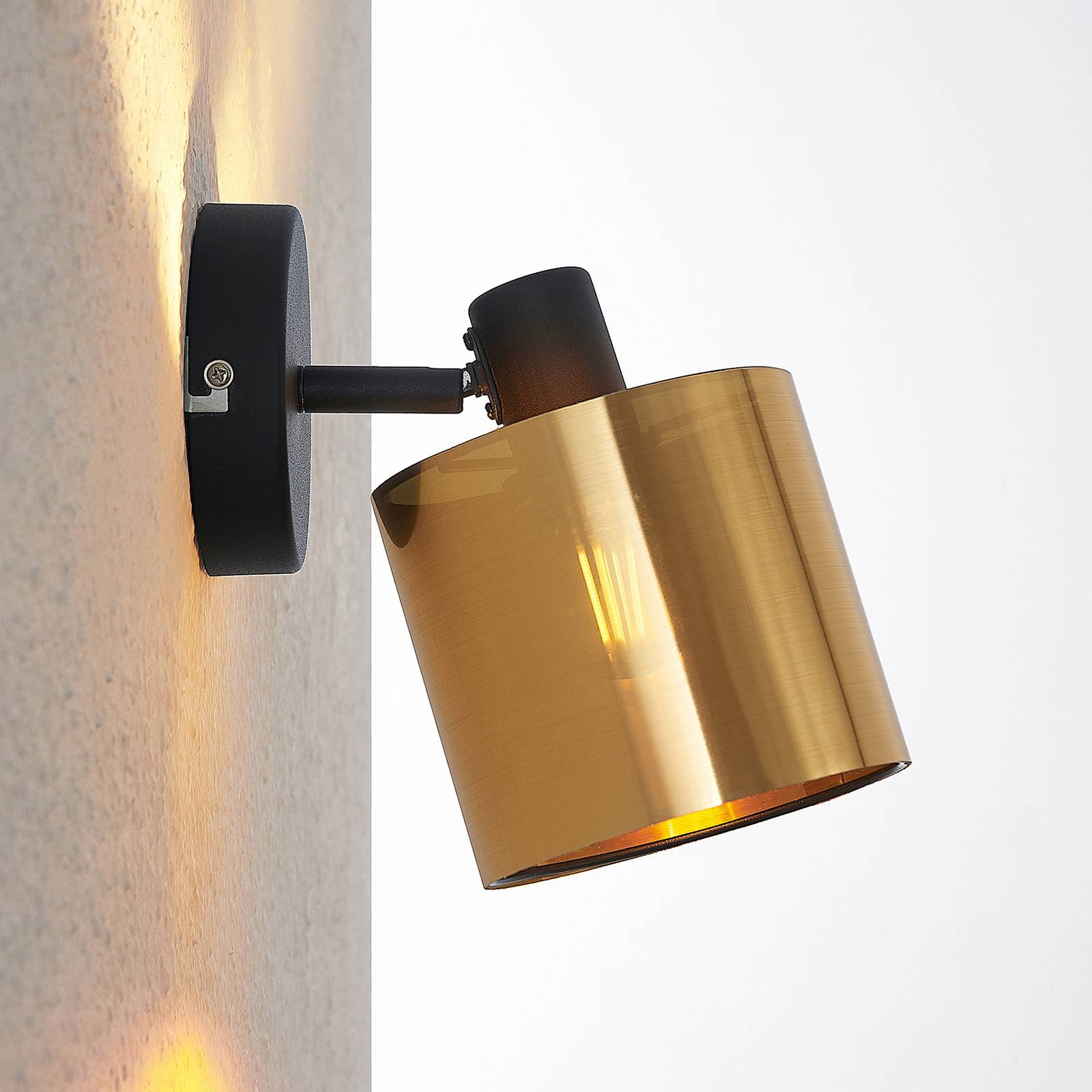 Elegante lampada da parete Joudy con paralume cilindrico in plastica in un tono di bronzo chiaro Joudy è un faretto che fornisce una luce accogliente quando è montato sulla parete. Il telaio della lampada è rotondo e ha una finitura nera opaca, mentre il paralume in PVC forma un efficace contrasto con questo, in quanto è sottile e ha una finitura spazzolata opaca in un tono di bronzo chiaro. Questo assicura un aspetto estremamente elegante della lampada da parete e permette anche alla luce di penetrare delicatamente attraverso la parete del paralume, in modo che si verifichi un effetto di luce accogliente. Le lampade a filamento LED nelle ottiche delle lampade a incandescenza sono fonti di luce sia visivamente che tecnicamente molto raccomandabili, dove consumano poca elettricità. Il paralume può essere ruotato a piacere.