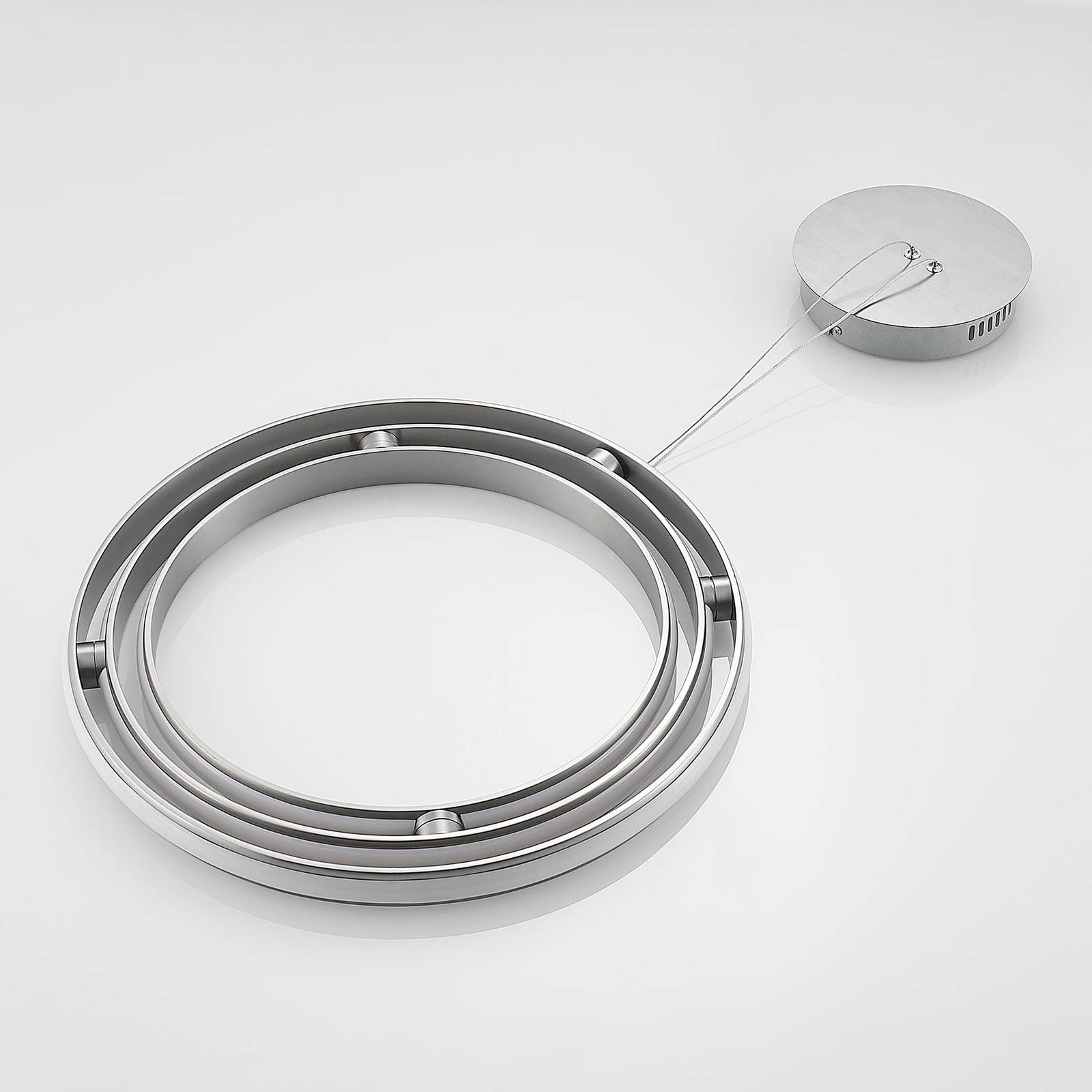 Lampada a sospensione a LED Kamilya in acciaio con aspetto audace La lampada a sospensione a LED Kamilya convince per il suo aspetto moderno e fresco e pone accenti attraenti sui soffitti abitabili. Il suo paralume è costituito da tre cerchi in acciaio sui quali scorrono i LED fissi. La disposizione sfalsata di questi crea un paralume rotondo e aperto. Tramite un interruttore a muro è possibile accendere e spegnere la lampada come di consueto. Grazie alla tecnologia di dimmerazione a 3 fasi con funzione off integrata, può essere dimmerata anche con tre diversi livelli di luminosità premendo più volte l'interruttore: 100 %, 40 % e 10 %. Così, la lampada a sospensione a LED Kamilya fornisce sempre la giusta illuminazione e con il suo aspetto chic si inserisce perfettamente in un soggiorno o in una camera da letto. Si integra senza sforzo negli stili d'arredo moderni e completa i mobili in modo benevolo.