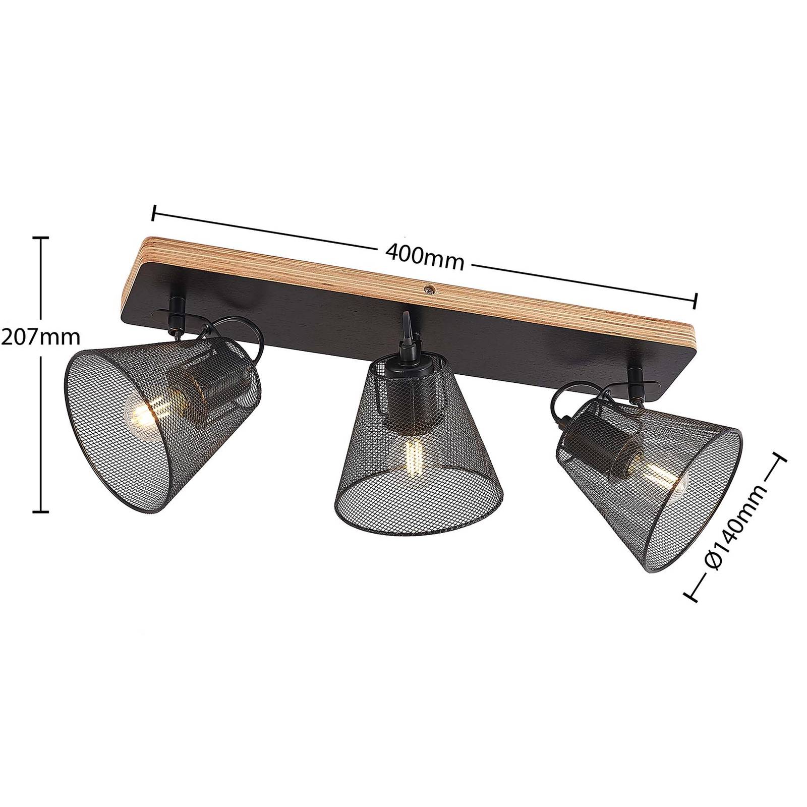 Plafoniera a tre luci Kirill con paralume a gabbia La plafoniera Kirill garantisce un aspetto fresco e sorprendente e un'illuminazione flessibile. Il suo supporto a soffitto in legno è dotato di tre paralumi in acciaio, che hanno un motivo che ricorda una gabbia. Il loro montaggio orizzontale consente l'illuminazione in diverse direzioni. Le sorgenti luminose da utilizzare generano una luce che crea un interessante schema di luce attraverso gli spazi vuoti all'interno delle tonalità. Per sottolineare questo effetto si consiglia di utilizzare lampadine a incandescenza. La lampada da soffitto Kirill fa una grande figura nel soggiorno o nella sala da pranzo e pone accenti decorativi all'interno dell'arredamento.