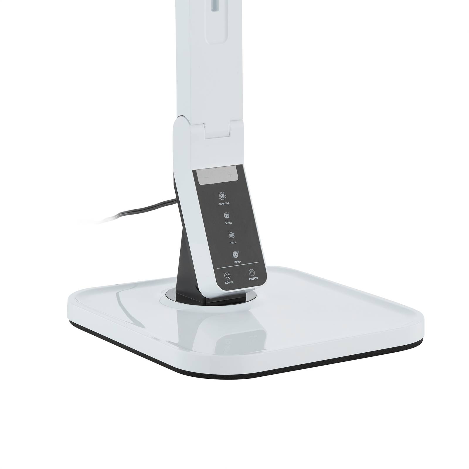 Lampada da tavolo LED dimmerabile Eleni dal design modernoCon numerosi vantaggi ed extra, la lampada da tavolo LED Eleni fa subito centro. Si presenta con un design moderno e lineare, particolarmente elegante grazie alla colorazione bianca. La sua struttura è dotata di due snodi, in modo che la luce possa essere sempre orientata secondo le preferenze personali. Alla base dell'apparecchio sono presenti diversi interruttori a sfioramento che possono essere utilizzati per regolare la luminosità di Eleni. Sono preimpostati quattro livelli di luminosità: "Lettura" (luce diurna, circa 5.200 K), "Studio" (luce diurna, circa 6.200 K), "Relax" (bianco caldo, circa 3.500 K) e "Sonno" (bianco caldo, circa 3.000 K). Oltre a queste modalità preimpostate, è possibile anche una fine gradazione del colore della luce attraverso un interruttore più e uno meno, con il quale è possibile variare la temperatura del colore nell'intervallo da 3.000 K (bianco caldo) a 6.200 K (luce diurna). Grazie a questa grande flessibilità, l'apparecchio da scrivania Eleni può fungere da fonte di luce per le occasioni più diverse, in quanto è in grado di adattarsi alle esigenze individuali in qualsiasi momento. Un'ulteriore caratteristica è il timer di 60 minuti. Se questo è attivato, la luce di Eleni si spegne automaticamente dopo un'ora.