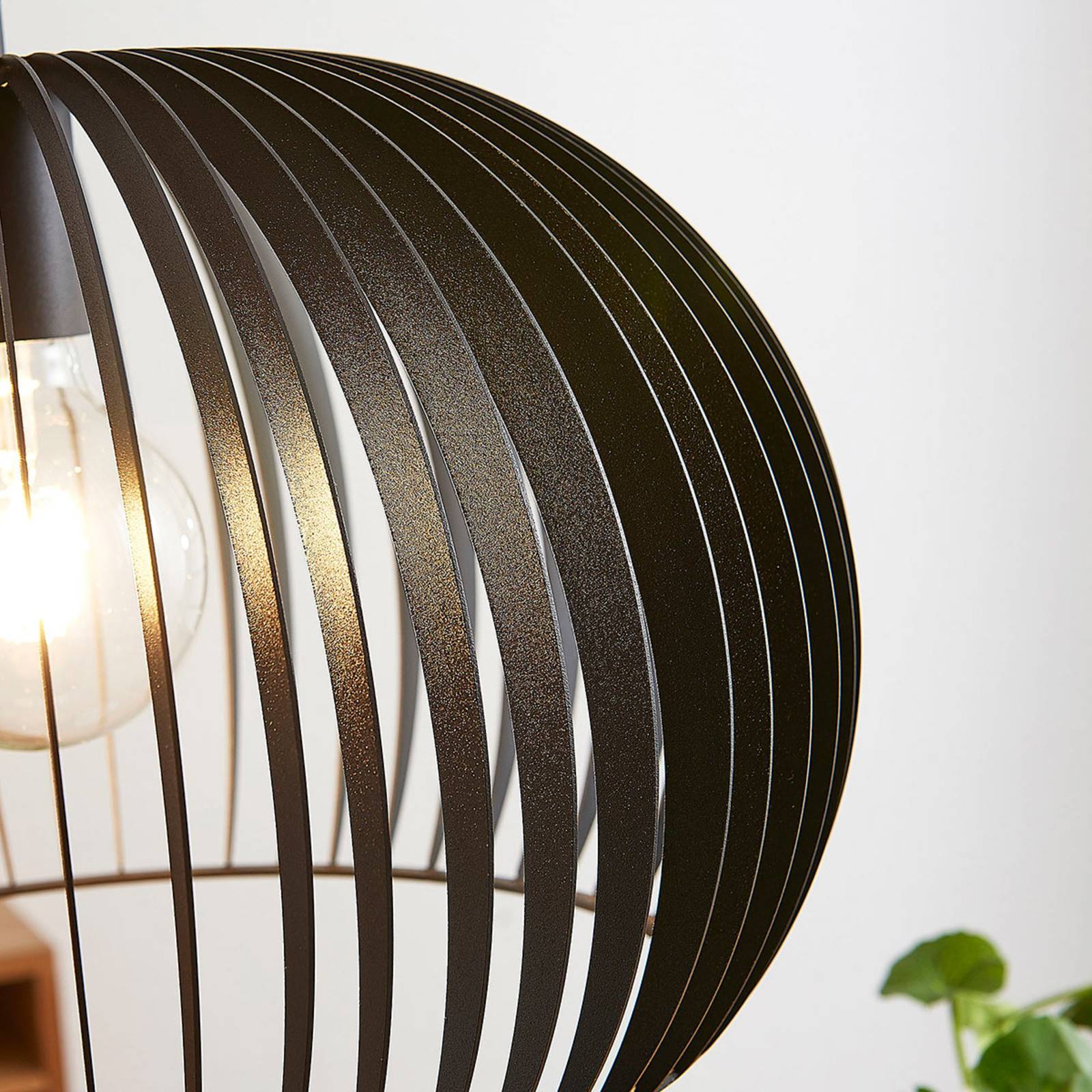 Grande lampada a sospensione Jusra con finitura nera ed efficace emissione luminosaJusra si inserisce perfettamente negli interni moderni e si presenta come una lampada a sospensione particolarmente elegante con un look a gabbia di tendenza. Come stecche, le aste metalliche nere leggermente ricurve sono disposte intorno al paralume in modo che l'aspetto complessivo sia una sorta di sfera che forma il paralume della lampada a sospensione. La luce viene emessa all'esterno con interessanti effetti scintillanti e appare leggermente attenuata. Grazie al paralume aperto, la luce viene emessa verso il basso senza ostacoli, in modo da illuminare perfettamente un tavolo da pranzo con Jusra.