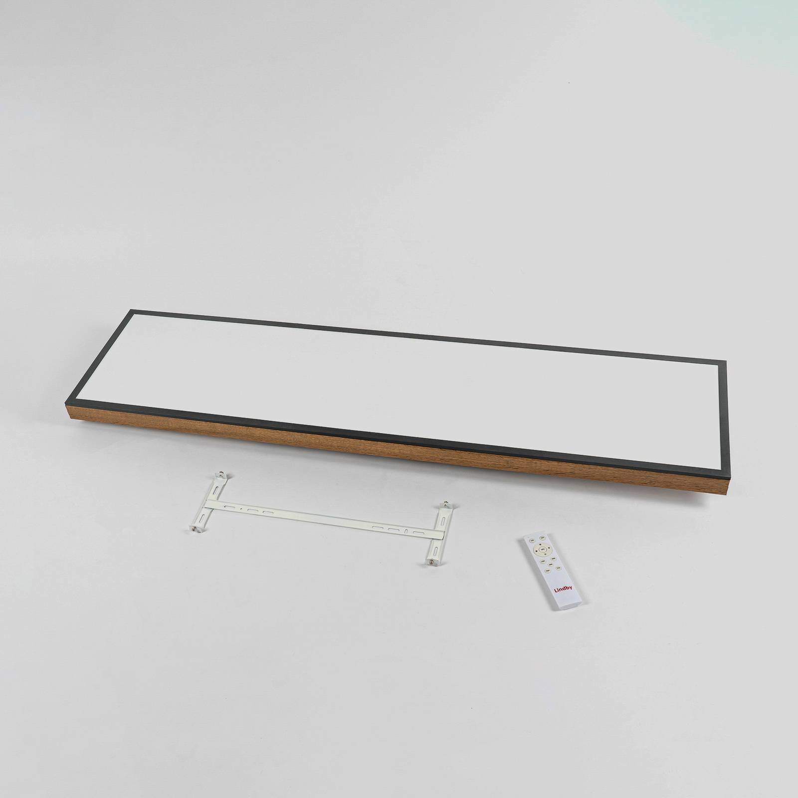 Plafoniera LED Laviona allungata con colore di luce variabile Laviona è una moderna plafoniera LED dall'aspetto rettangolare che si distingue per l'attraente decorazione in legno. È ideale per illuminare stanze o corridoi di grandi dimensioni e convince per la sua economica tecnologia LED. Utilizzando un telecomando o un normale interruttore a parete, è possibile cambiare facilmente il colore di luce da bianco caldo (2.700 K) a bianco neutro (4.500 K) e luce diurna (6.500 K), creando le condizioni di illuminazione perfette per ogni situazione.