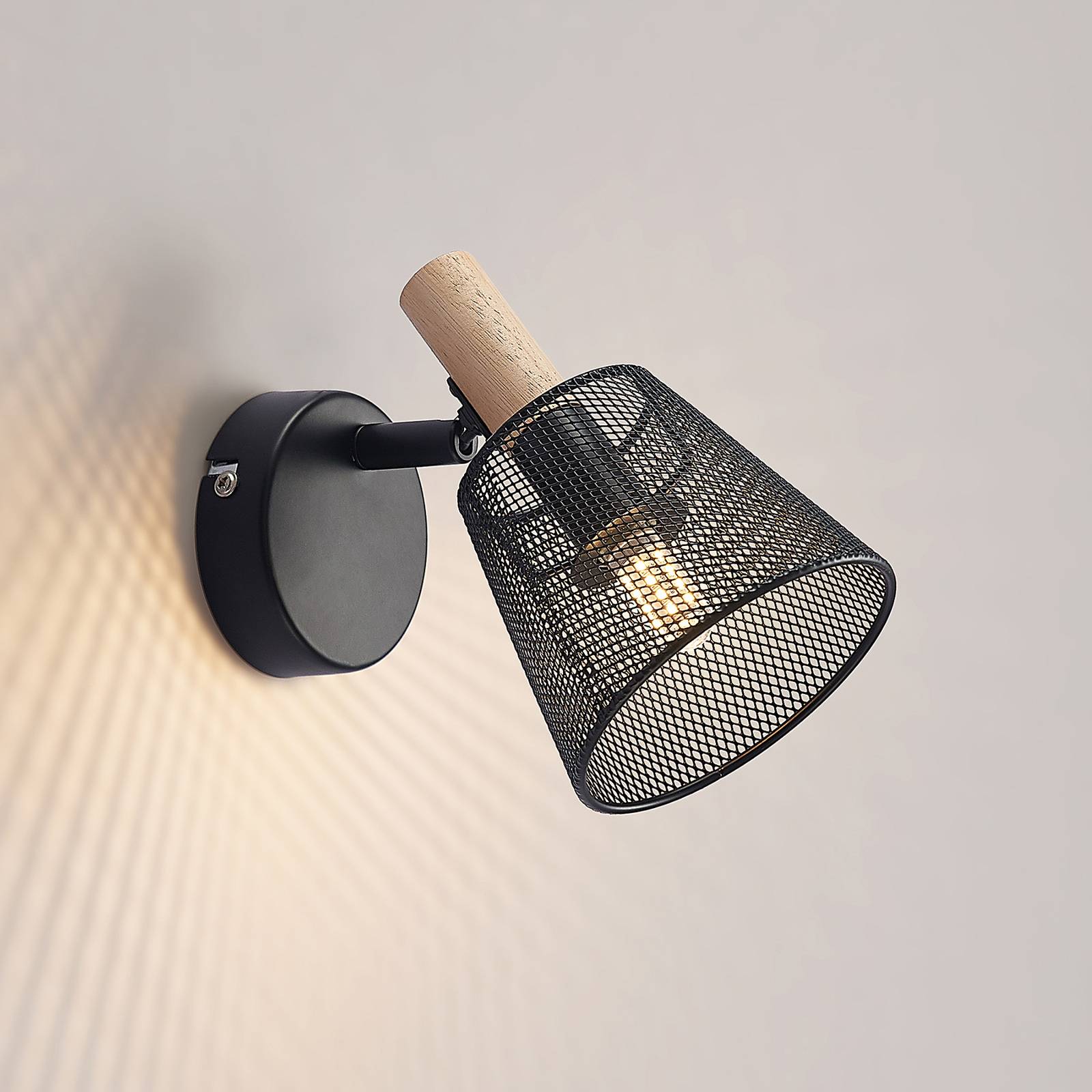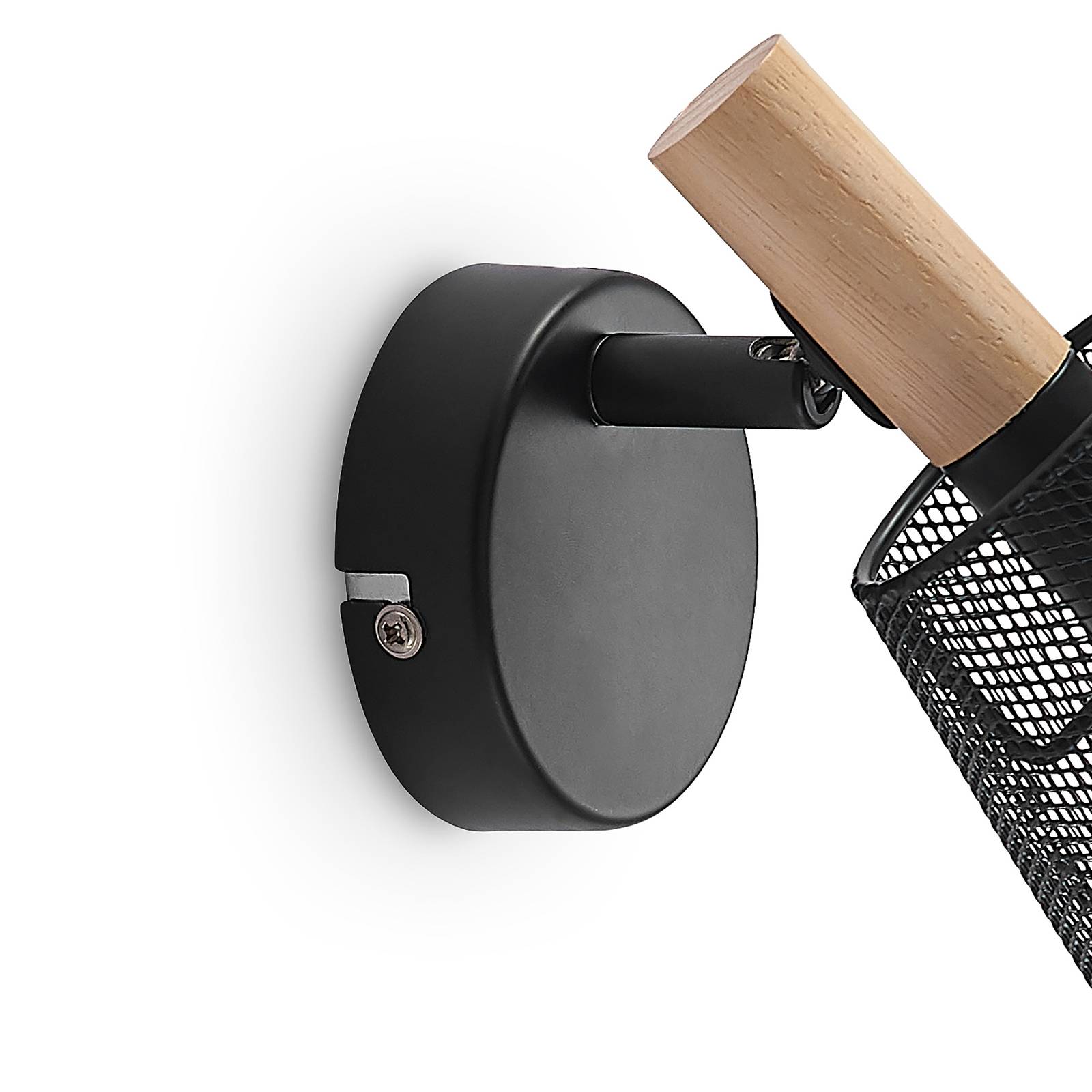 Elegante spot a soffitto Layne con schermo a cestello nero ed elemento in legno Layne si adatta perfettamente a molti interni moderni e costituisce un ottimo punto mobile sul soffitto, ma può anche essere montato a parete, se necessario. Il paralume trasparente è realizzato in metallo e assomiglia a un cestino di fili di filigrana, in modo che si possa ancora vedere all'interno del paralume e vedere la fonte di luce. Il design della superficie nera si adatta bene al moderno design generale e un elemento in legno completa il look molto elegante e contrastante. Il paralume può essere spostato se necessario, in quanto è collegato alla staffa con uno snodo, in modo che possa essere ruotato e ruotato a piacere.